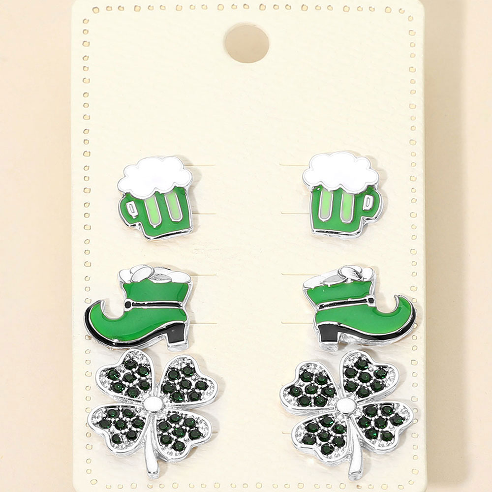 3Pairs - St Patricks Clover Boot Beer Mug Stud Earring Set