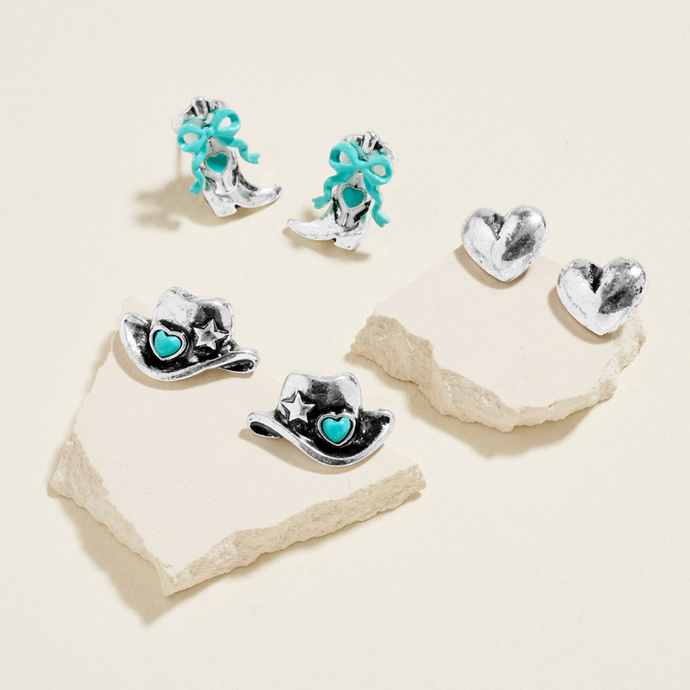 Details • Size : 0.5" - 0.7" L • Titanium Post Back • Three-pair western-inspired stud earring assortment featuring heart, hat, and boot motifs for mix-and-match charm. Designed for effortless everyday styling, gifting, and travel-ready versatility, this coordinated trio delivers playful, statement-worthy looks in one compact, easy-to-style jewelry set. • Hypoallergenic • Lead and Nickel Compliant