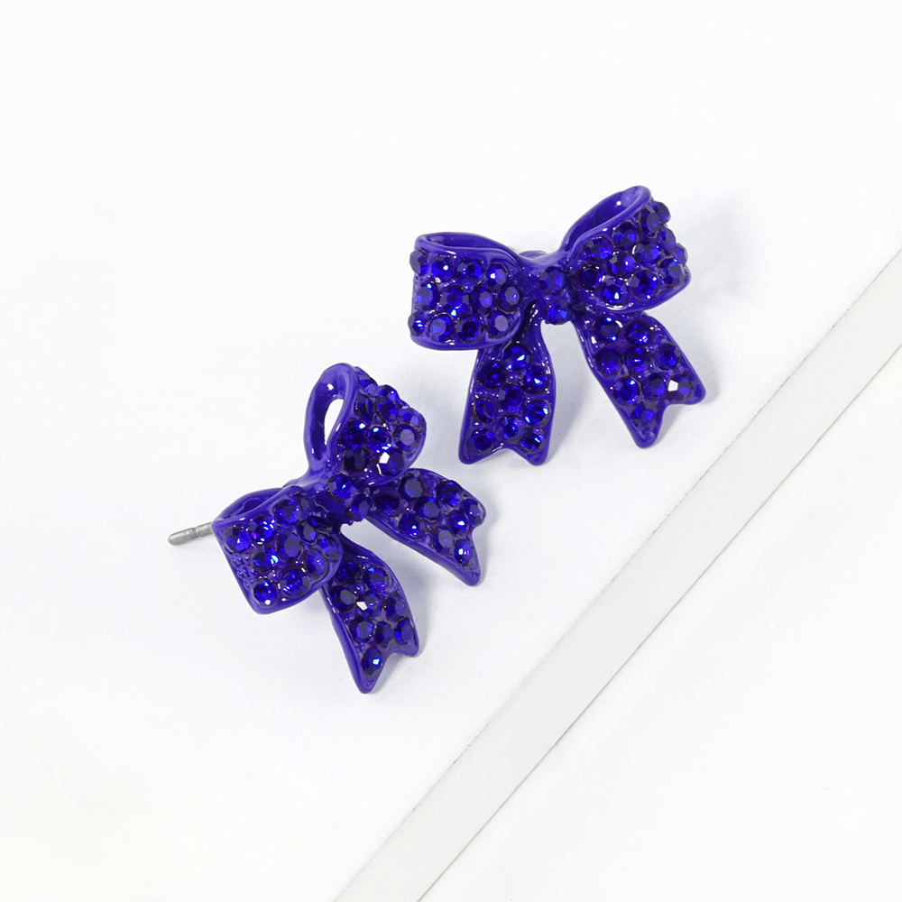 Details • Size : 0.75" X 0.6" • Post Back • Dazzling rhinestone bow earrings designed to add a feminine sparkle to any outfit. These chic stud earrings combine classic charm with modern glam, perfect for weddings, parties, or everyday elegance. Lightweight and radiant, they elevate your look with timeless sophistication. • Lead and Nickel Compliant