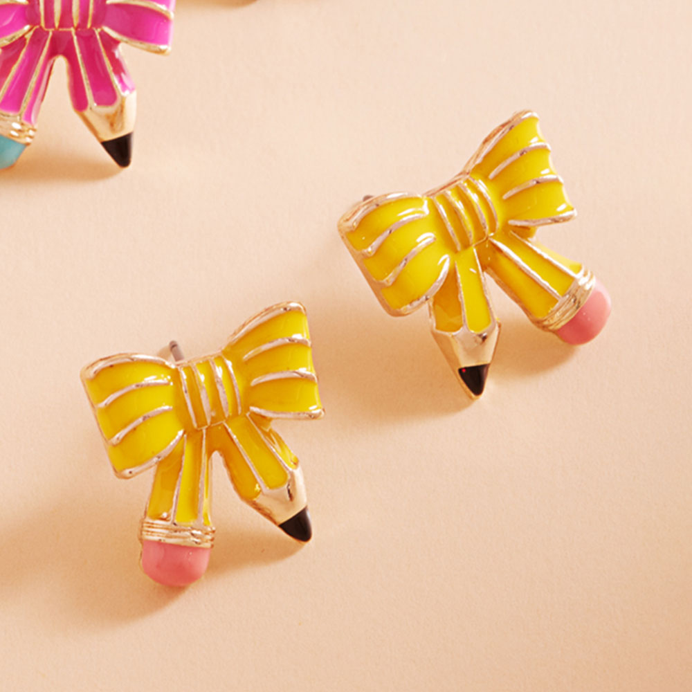 Details • Size : 0.7" X 0.8" • Titanium Post Back • Adorable pencil bow stud earrings designed with a fun school-inspired look. Perfect for teachers, students, and themed outfits, these lightweight studs add a playful touch to any style. Great for gifting, classroom events, or everyday wear with a charming academic accent. • Lead and Nickel Compliant • Hypoallergenic