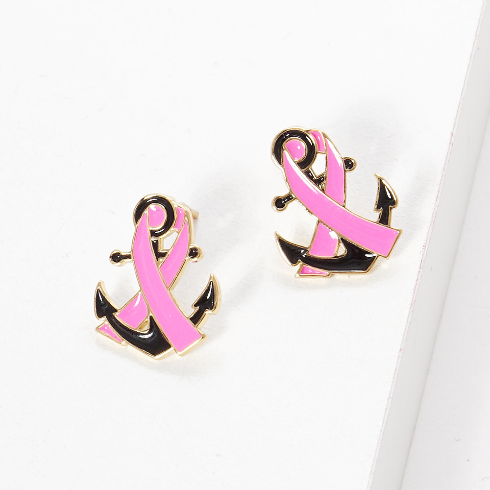 Details • Size : 0.6" X 0.75" • Post Back • Show your support with these Pink Ribbon Anchor earrings, symbolizing strength, resilience, and hope. Featuring a striking anchor design intertwined with the iconic ribbon, this meaningful jewelry makes a powerful statement of awareness, courage, and unshakable support. • Lead and Nickel Compliant • Made In Korea • Gold Dipped