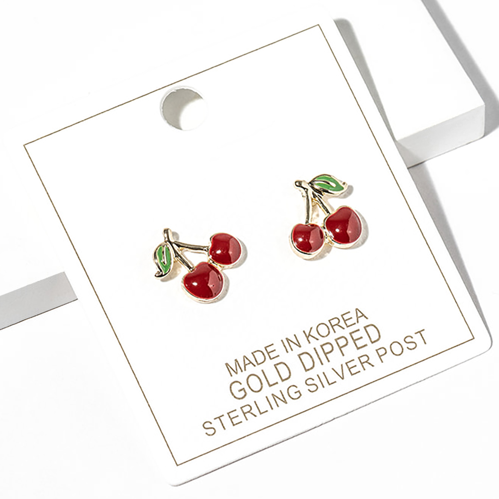 Details • Size : 0.5" X 0.5" • Adorable cherry stud earrings featuring a playful fruit design with gold dipped sterling silver posts. Perfect for adding a fun and stylish touch to any outfit, these cute earrings bring a youthful charm and modern flair, making them ideal for everyday wear or gifting. • Gold Dipped • Lead and Nickel Compliant • Sterling Silver Post