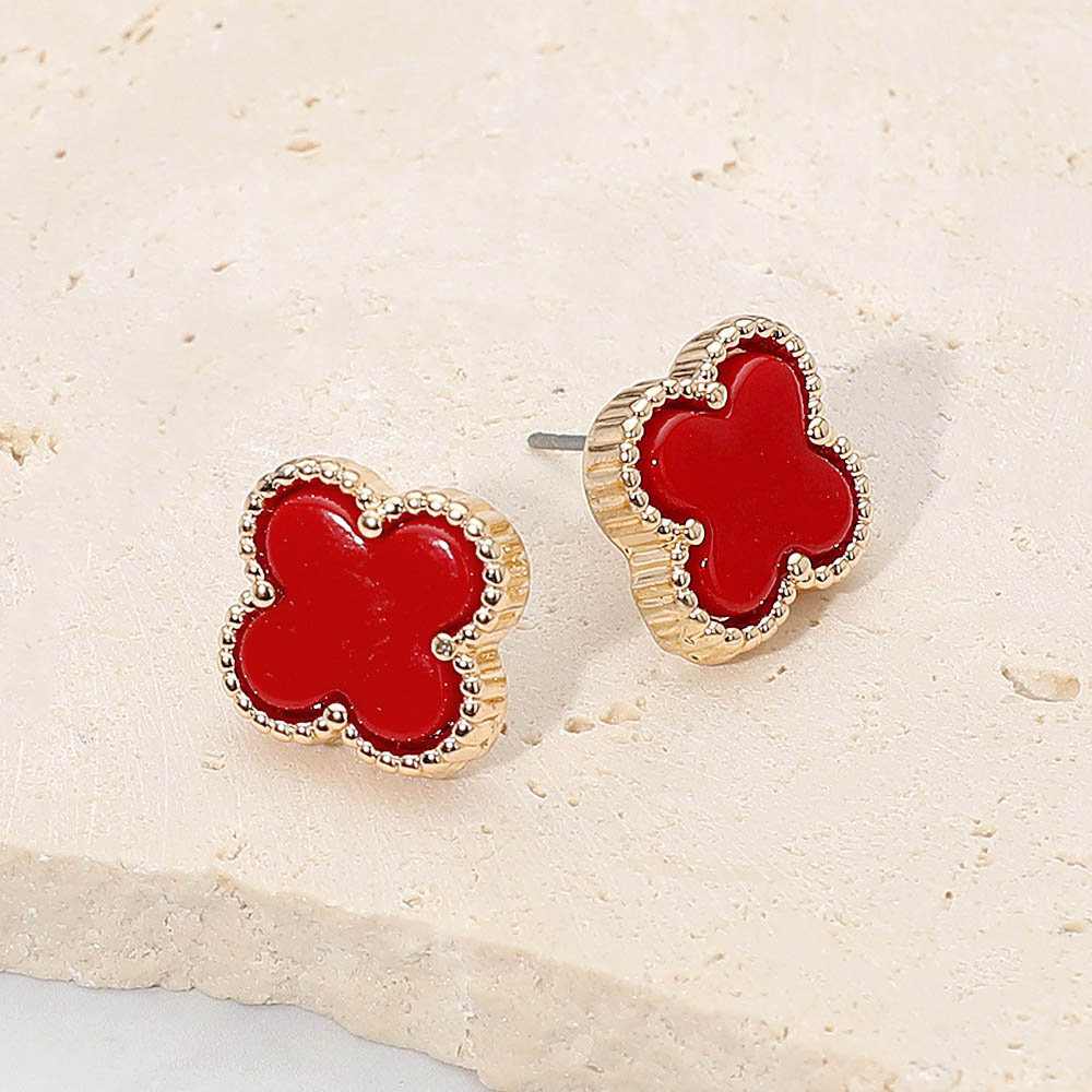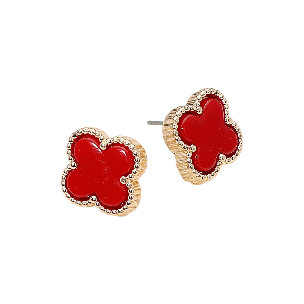 Details • Size : 0.6" X 0.6" • Post Back • Stylish stud earrings featuring a quatrefoil shape framed with textured trim for a chic, timeless look. Perfect for elevating everyday outfits or pairing with elegant attire, these earrings offer a touch of sophistication and modern simplicity in one graceful design. • Lead and Nickel Compliant