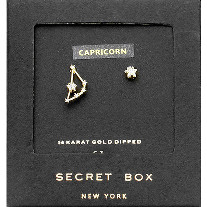 SECRET BOX_14K Gold Dipped CZ Zodiac Sign Capricorn Stud Earrings