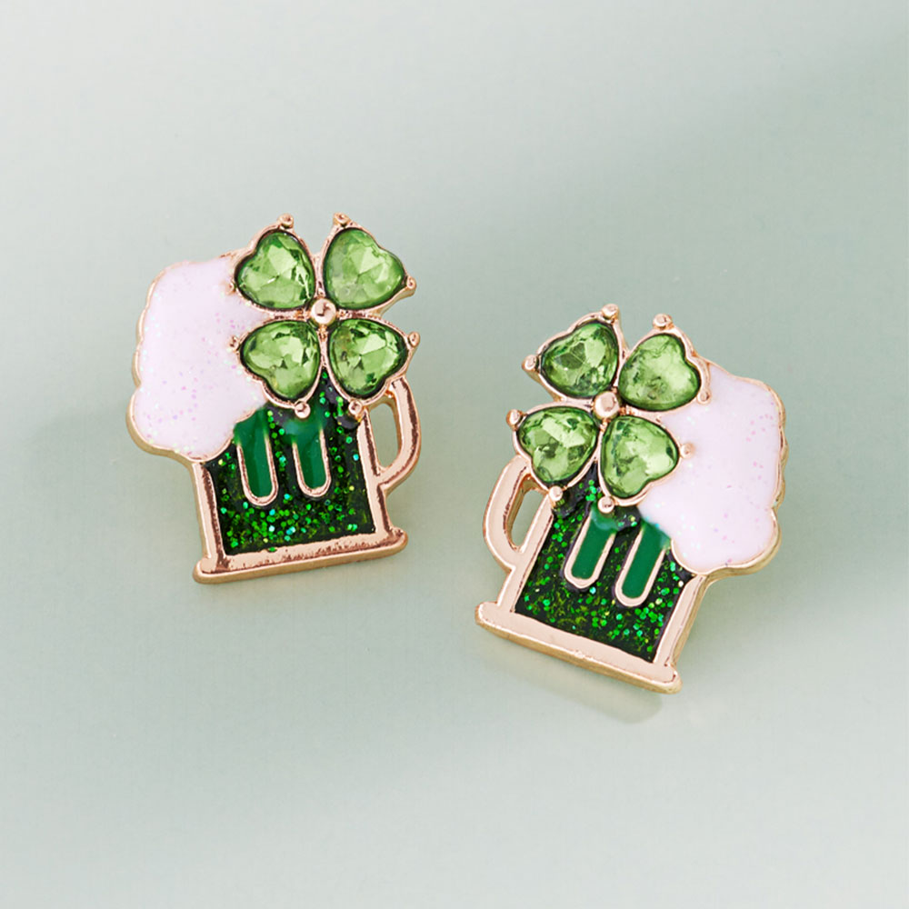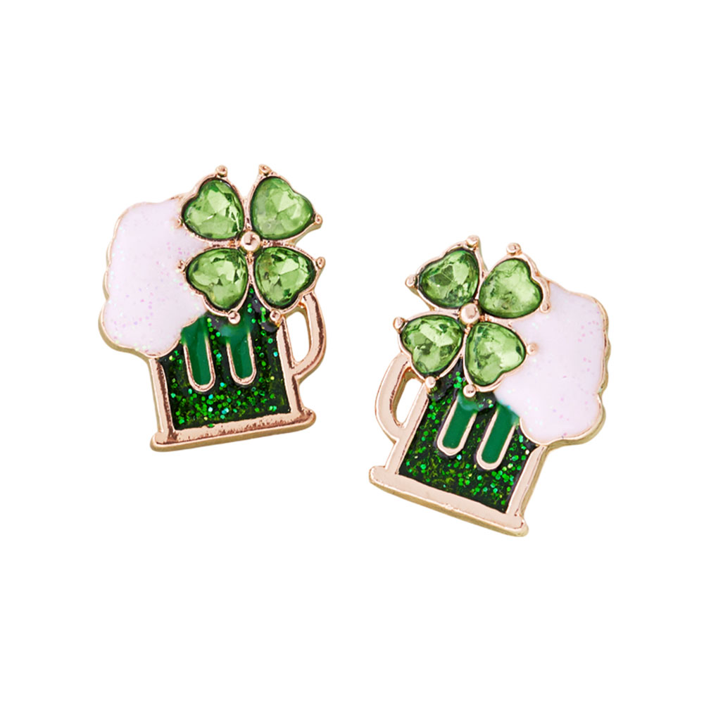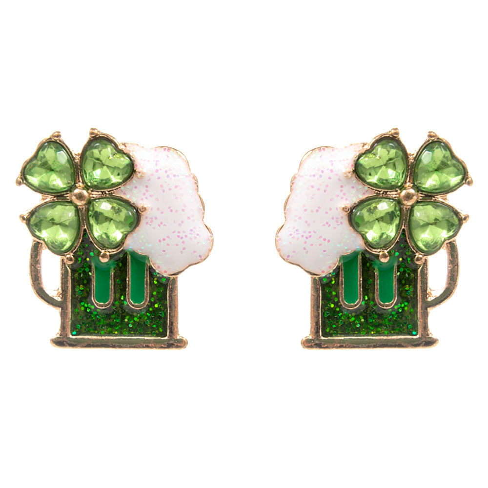 Details • Size : 0.7" X 0.75" • Titanium Post Back • Festive stud earrings featuring a playful mug and shamrock motif with sparkling accents for a cheerful, novelty-inspired look. Lightweight and comfortable for all-day wear, ideal for celebrations, themed outfits, party favors, or gifting to add fun charm to any accessory collection. • Hypoallergenic • Lead and Nickel Compliant