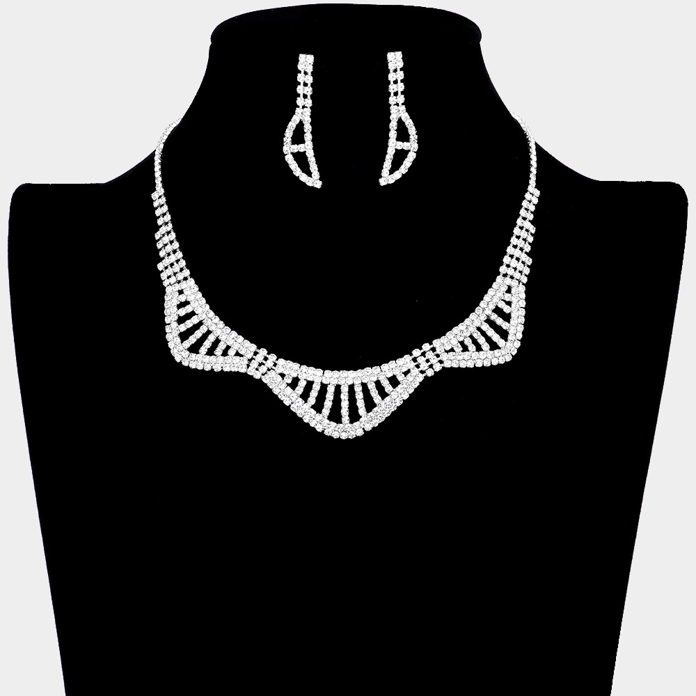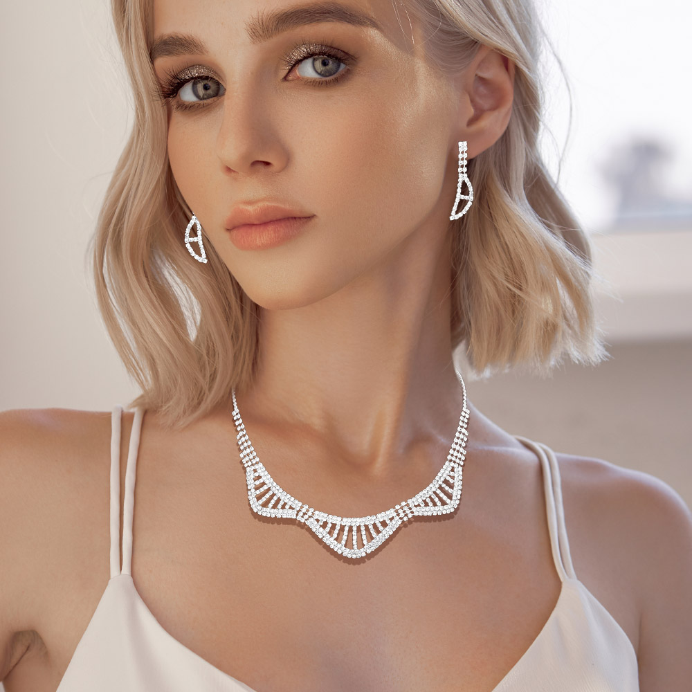 Details • Necklace Size : 12" L + 4" L • Decor Size : 0.75" L • Earring Size : 1.3" L • Elevate your style with this crystal fan necklace and matching earrings set. Featuring a modern geometric design with sparkling stones, this elegant jewelry set is perfect for weddings, parties, and glamorous evening events. • Lead and Nickel Compliant