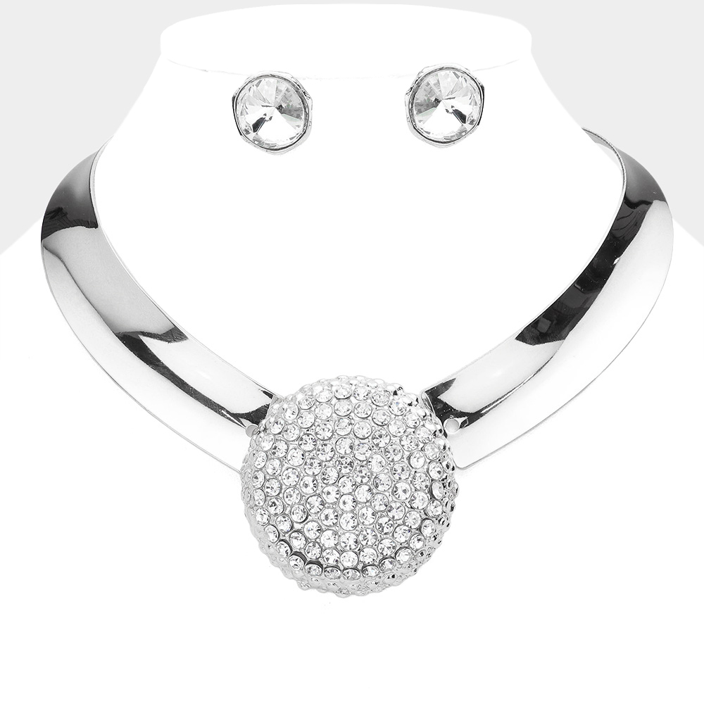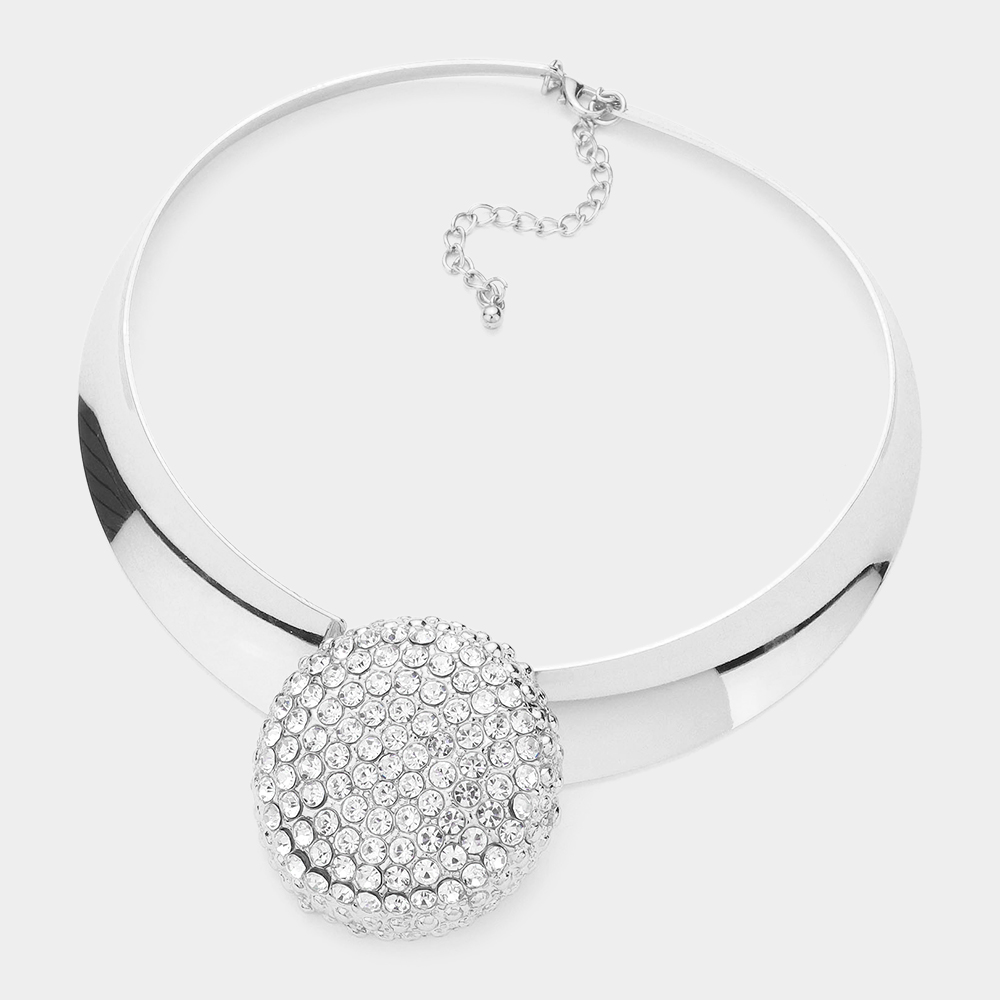 Round Rhinestone Paved Pendant Accented Metal Evening Choker Necklace
