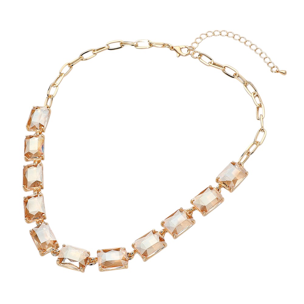 • This elegant gemstone chain necklace features a row of precisely cut stones linked with a sleek chain for a refined, modern look. Its adjustable closure ensures a comfortable fit, making it a sophisticated accessory for formal occasions, evening wear, or adding a statement touch to everyday style.