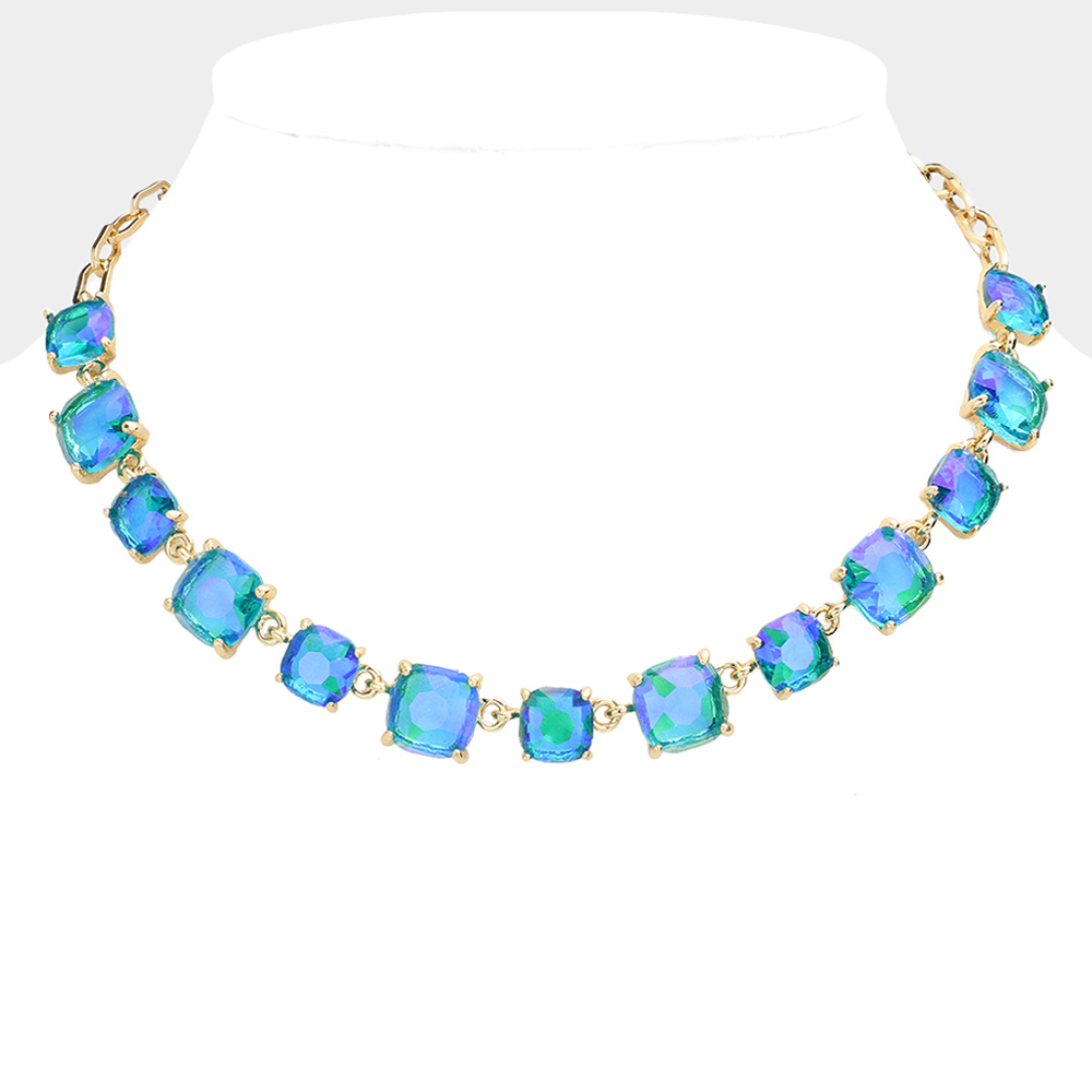 Details • Necklace Size : 16" + 2.75" L • Decor Size : 0.5" L • Elevate your style with this stunning square cut gemstone statement necklace. Featuring shimmering faceted stones linked in a classic design, it offers a chic adjustable fit. Perfect for evening wear, weddings, parties, or adding a sophisticated sparkle to your everyday look. • Lead and Nickel Compliant