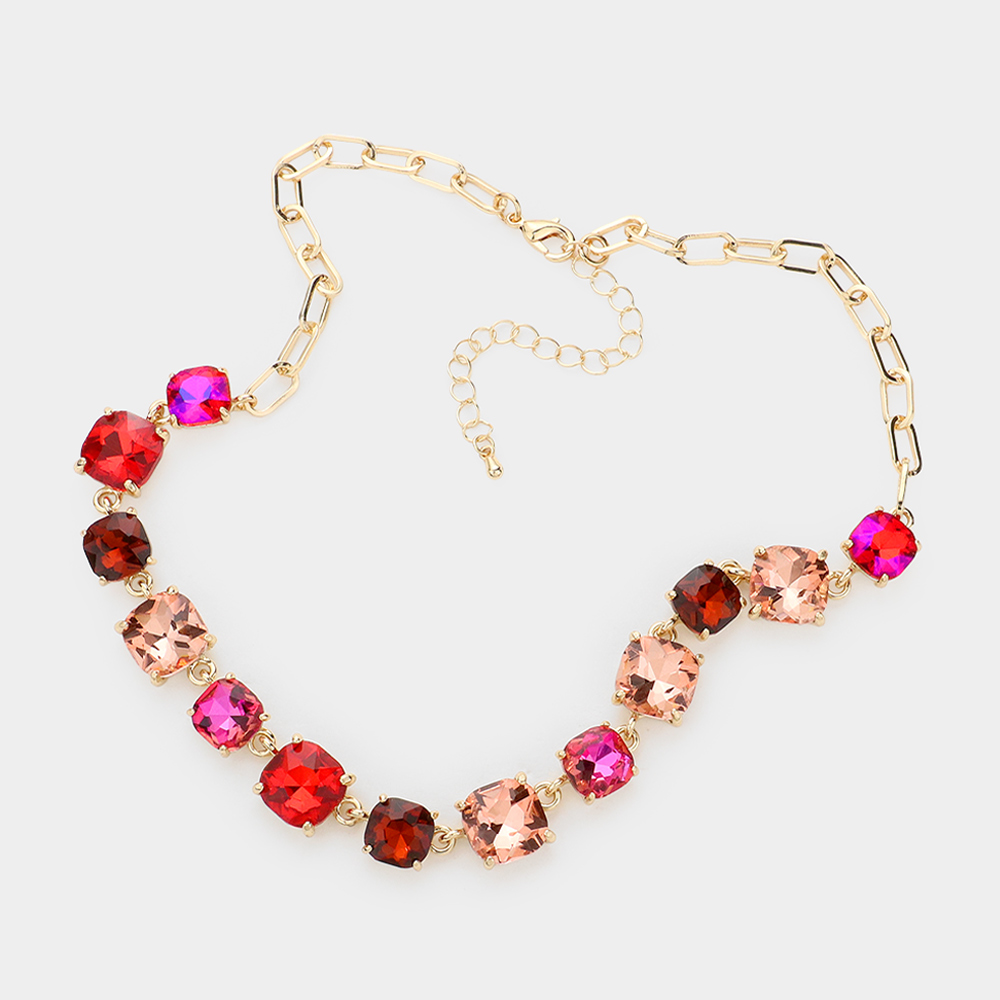 • Elevate your style with this stunning square cut gemstone statement necklace. Featuring shimmering faceted stones linked in a classic design, it offers a chic adjustable fit. Perfect for evening wear, weddings, parties, or adding a sophisticated sparkle to your everyday look.