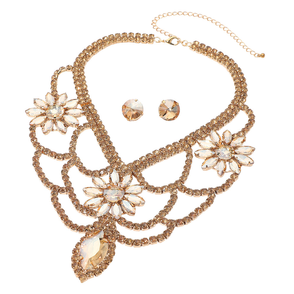 • Glamorous statement bib necklace and earring set featuring bold floral crystal clusters and cascading layered detailing. Designed to elevate evening looks, special events, and formal occasions with eye-catching sparkle and dramatic elegance perfect for standout styling.