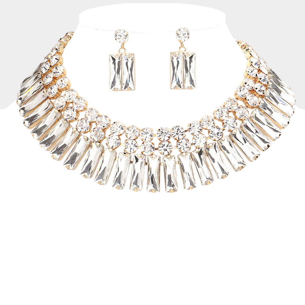Details • Necklace Size : 16" + 4.5" L • Decor Size : 1.5" L • Earring Size : 1.5" L • Shine from every angle with this iridescent rhinestone statement necklace and matching earrings. Featuring radiant rectangular crystals paired with shimmering round stones, this bold set reflects rainbow hues for a dazzling finish. Perfect for stage, pageants, parties, and special occasions, this design instantly elevates any evening or event look. Lightweight yet striking, it’s a go-to accessory for making a glamorous entrance.