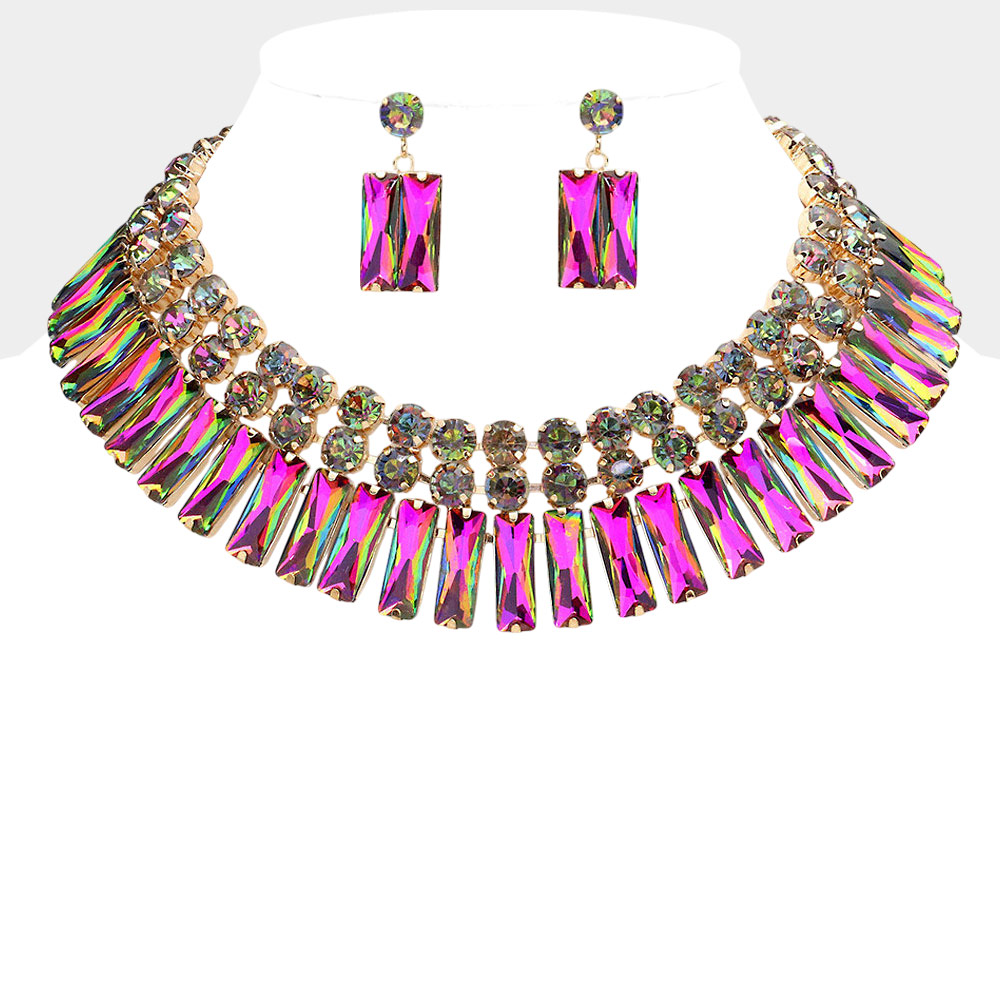• Shine from every angle with this iridescent rhinestone statement necklace and matching earrings. Featuring radiant rectangular crystals paired with shimmering round stones, this bold set reflects rainbow hues for a dazzling finish. Perfect for stage, pageants, parties, and special occasions, this design instantly elevates any evening or event look. Lightweight yet striking, it’s a go-to accessory for making a glamorous entrance.