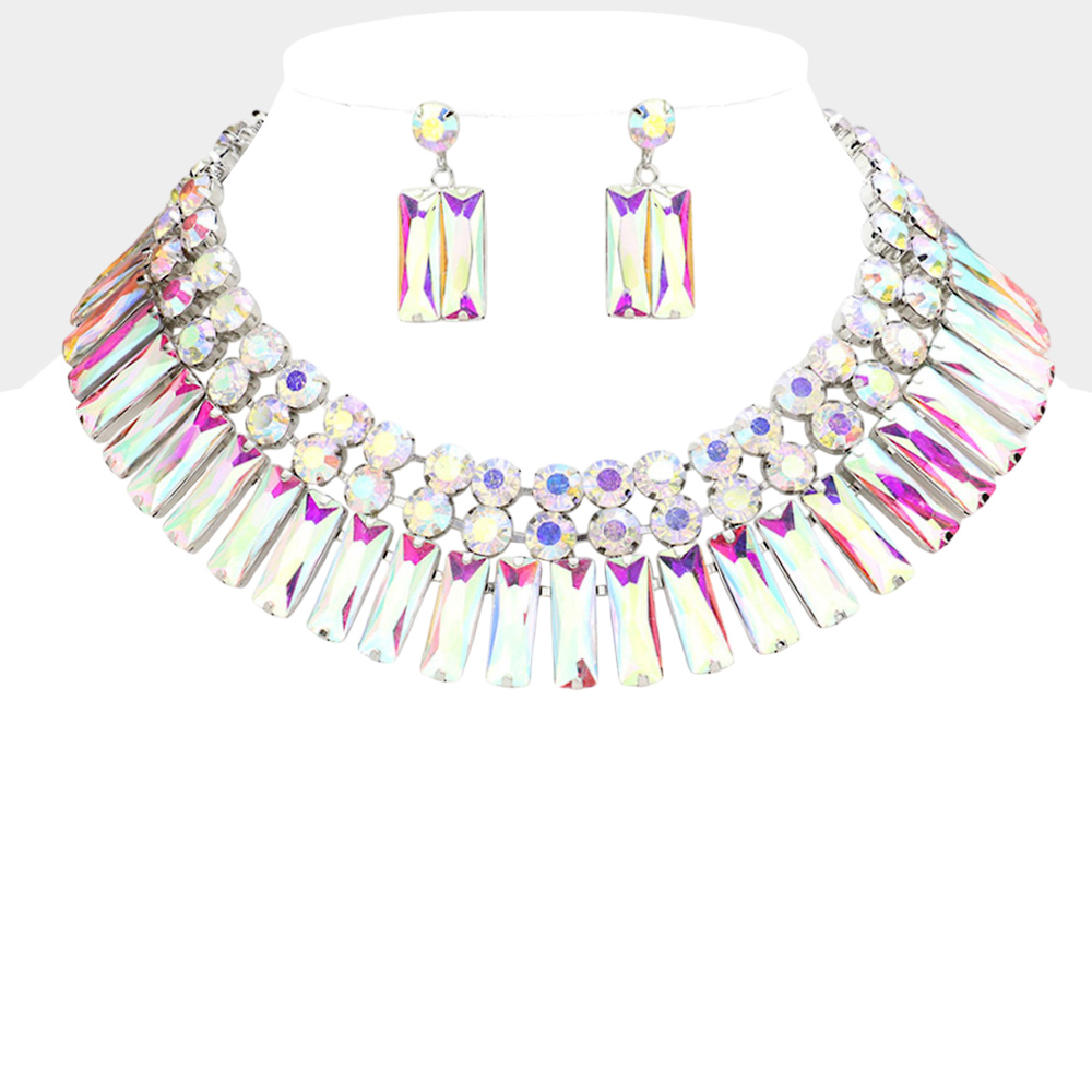 • Shine from every angle with this iridescent rhinestone statement necklace and matching earrings. Featuring radiant rectangular crystals paired with shimmering round stones, this bold set reflects rainbow hues for a dazzling finish. Perfect for stage, pageants, parties, and special occasions, this design instantly elevates any evening or event look. Lightweight yet striking, it’s a go-to accessory for making a glamorous entrance.