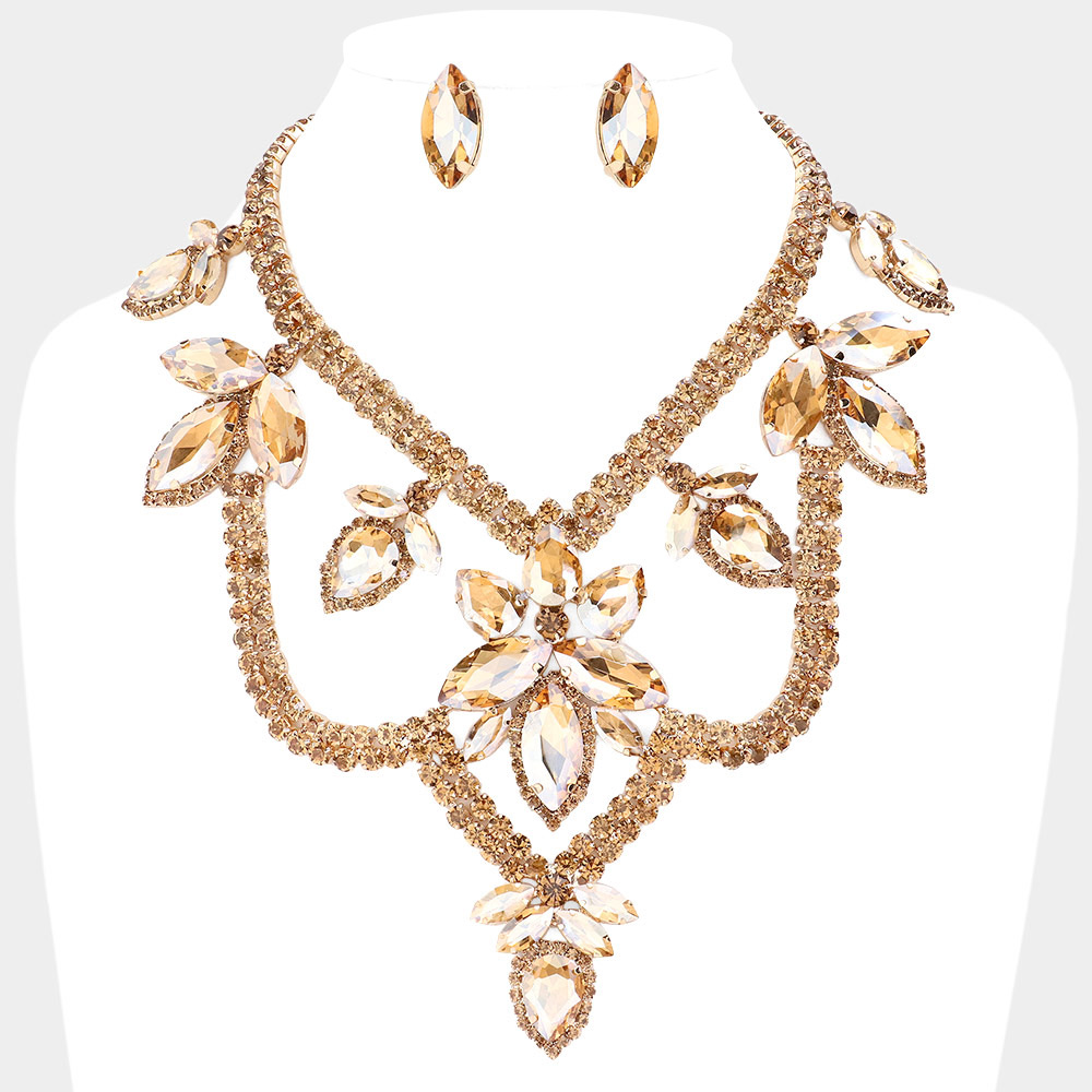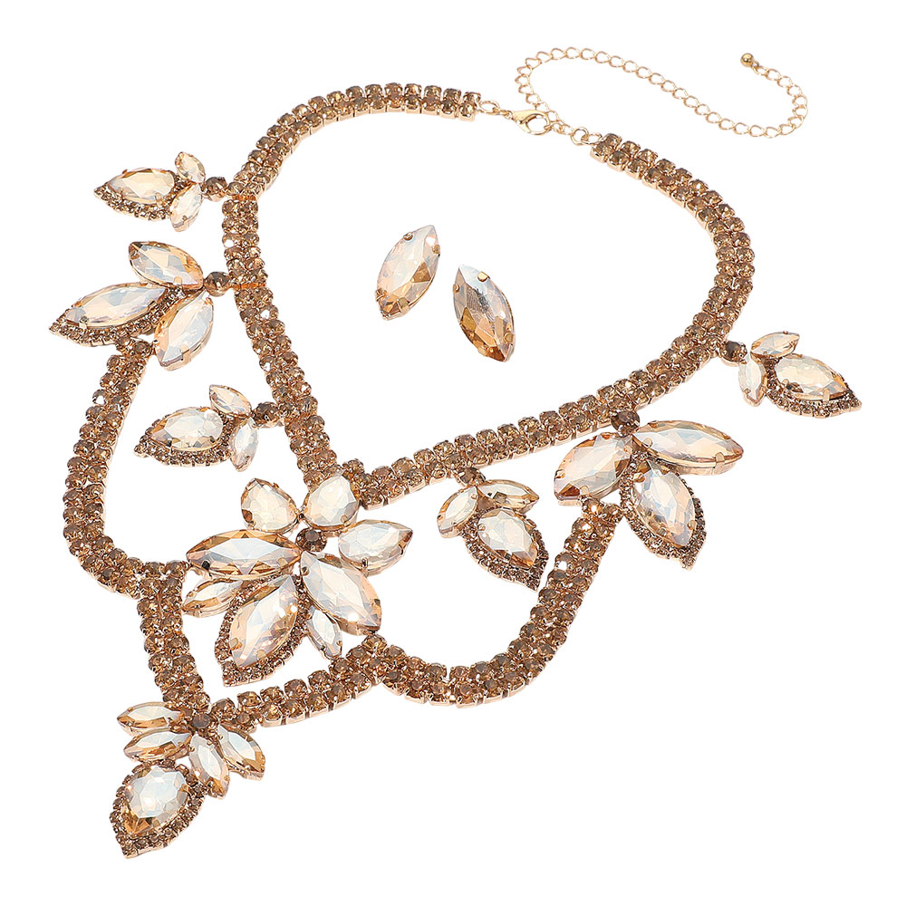• Elegant statement bib necklace and earring set featuring sparkling crystal leaf clusters and layered detailing for a glamorous, eye-catching finish. Perfect for evening events, formals, weddings, and special occasions, adding radiant shine and dramatic sophistication to any standout look.