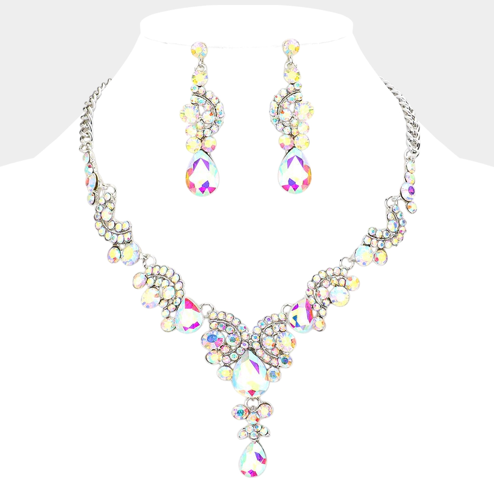 • Stunning teardrop crystal necklace and earring set designed with intricate clustered detailing and sparkling stones. Features a graceful V-shaped centerpiece and matching drop earrings, perfect for formal events, weddings, parties, and special occasions. A glamorous statement set that elevates any outfit.