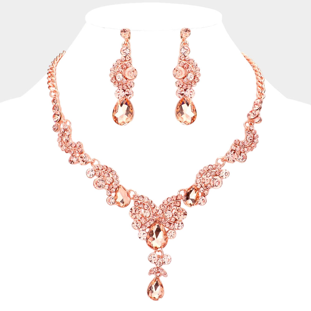 • Stunning teardrop crystal necklace and earring set designed with intricate clustered detailing and sparkling stones. Features a graceful V-shaped centerpiece and matching drop earrings, perfect for formal events, weddings, parties, and special occasions. A glamorous statement set that elevates any outfit.