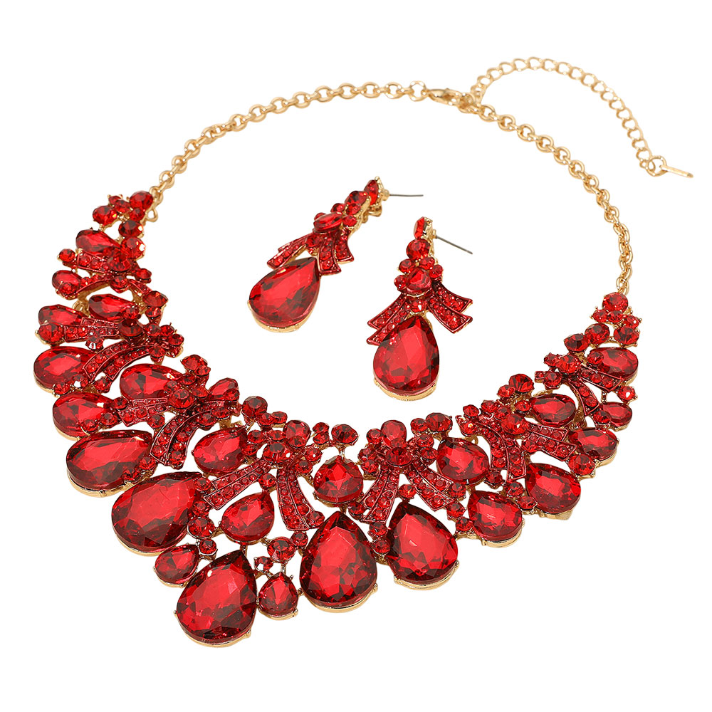 • Make an unforgettable impression with this statement teardrop bib necklace and earring set. Adorned with an array of dazzling stones and intricate detailing, this bold jewelry set adds luxurious sparkle and sophistication—perfect for weddings, galas, and evening events.