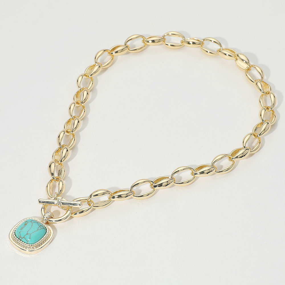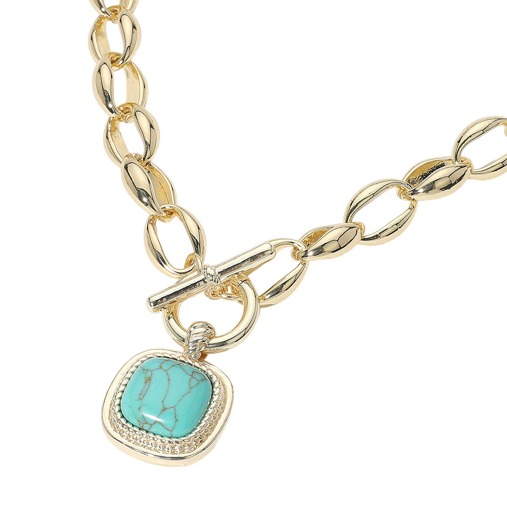Details • Necklace Size : 17" + 0.5" L • Decor Size : 1.2" L • Toggle Closure • Bold necklace featuring a chunky link chain and a square turquoise pendant with toggle clasp detail. A standout piece perfect for adding a touch of natural elegance to casual or dressy outfits. • Gold Dipped