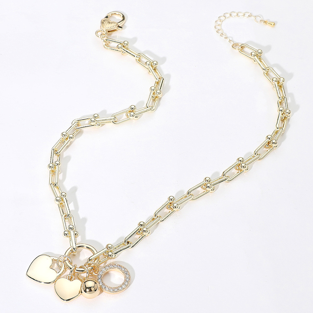 Details • Necklace Size : 17.5" + 3.75" L • Pendant Size : 1.7" L • Modern chunky chain necklace adorned with heart and circle charms, including a crystal-embellished pendant. A bold yet elegant statement piece perfect for everyday or evening wear. • Gold Dipped • CZ Cubic Zirconia
