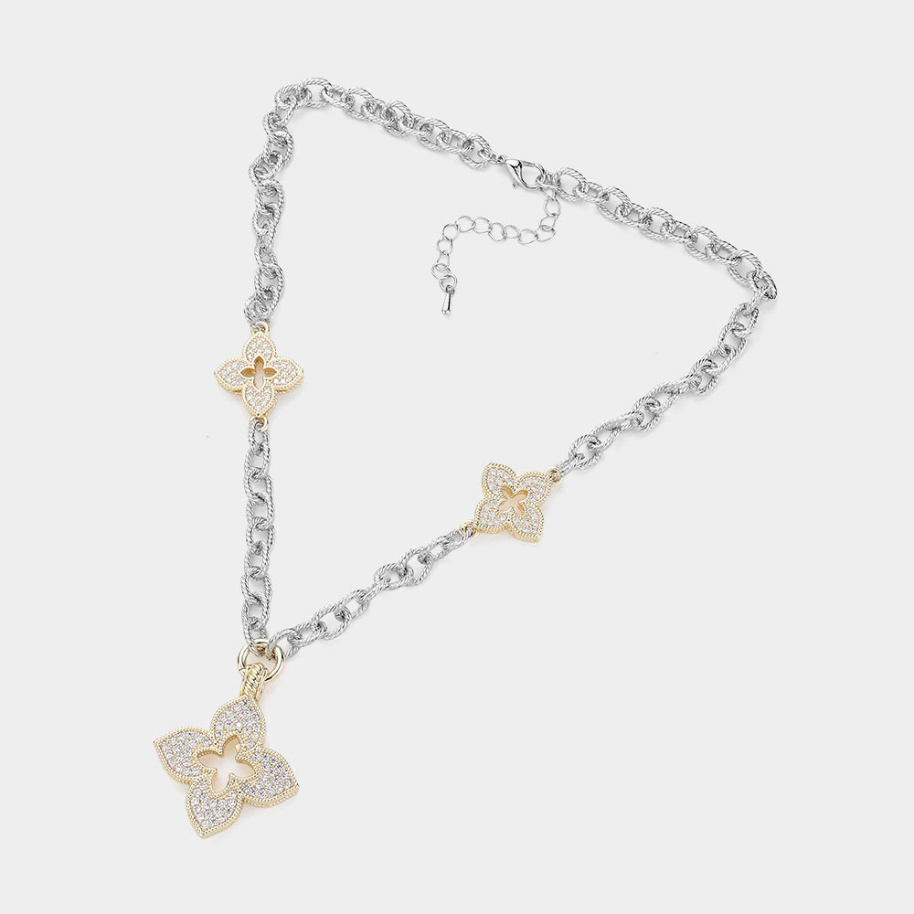 Details • Necklace Size : 16" + 2" L • Pendant Size : 1.25" X 1.75" • Elevate your style with this two-tone floral pendant necklace featuring shimmering crystal accents and a bold chain design. Perfect for special occasions or as an elegant everyday piece, it offers timeless sophistication and makes a stunning gift choice. • Gold Dipped • CZ Cubic Zirconia