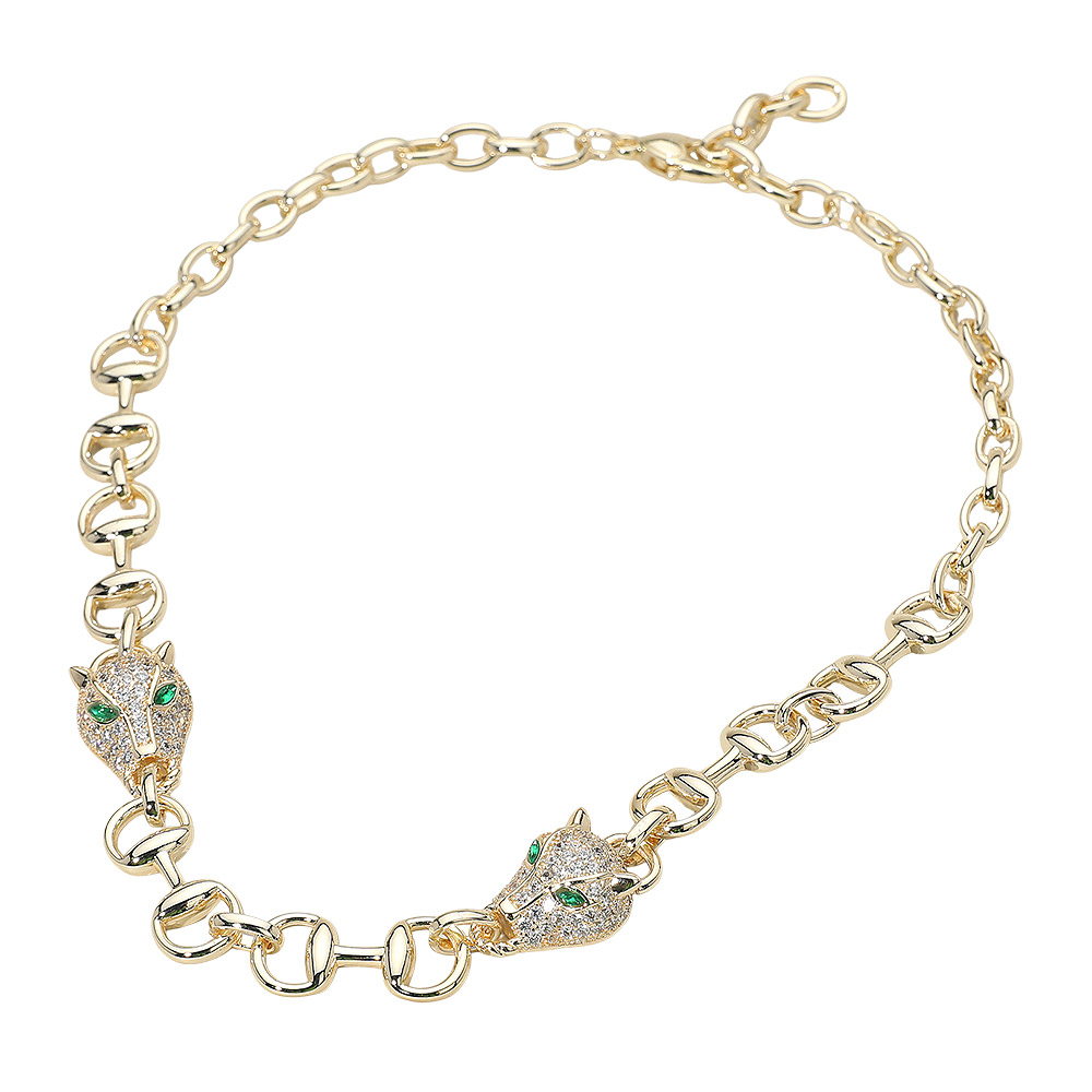 Details • Necklace Size : 18" + 2" L • Decor Size : 0.75" L • Stylish chain necklace featuring bold panther head motifs with sparkling cz accents and linked chain details. A striking statement piece designed to elevate any look with its fierce character and refined craftsmanship, perfect for gifting or adding standout charm to everyday style. • Gold Dipped • CZ Cubic Zirconia