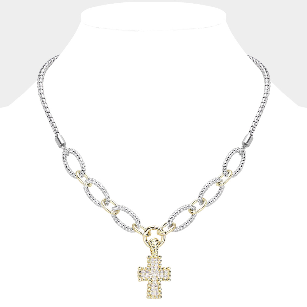 14K Gold Plated Two Tone CZ Stone Paved Cross Pendant Necklace