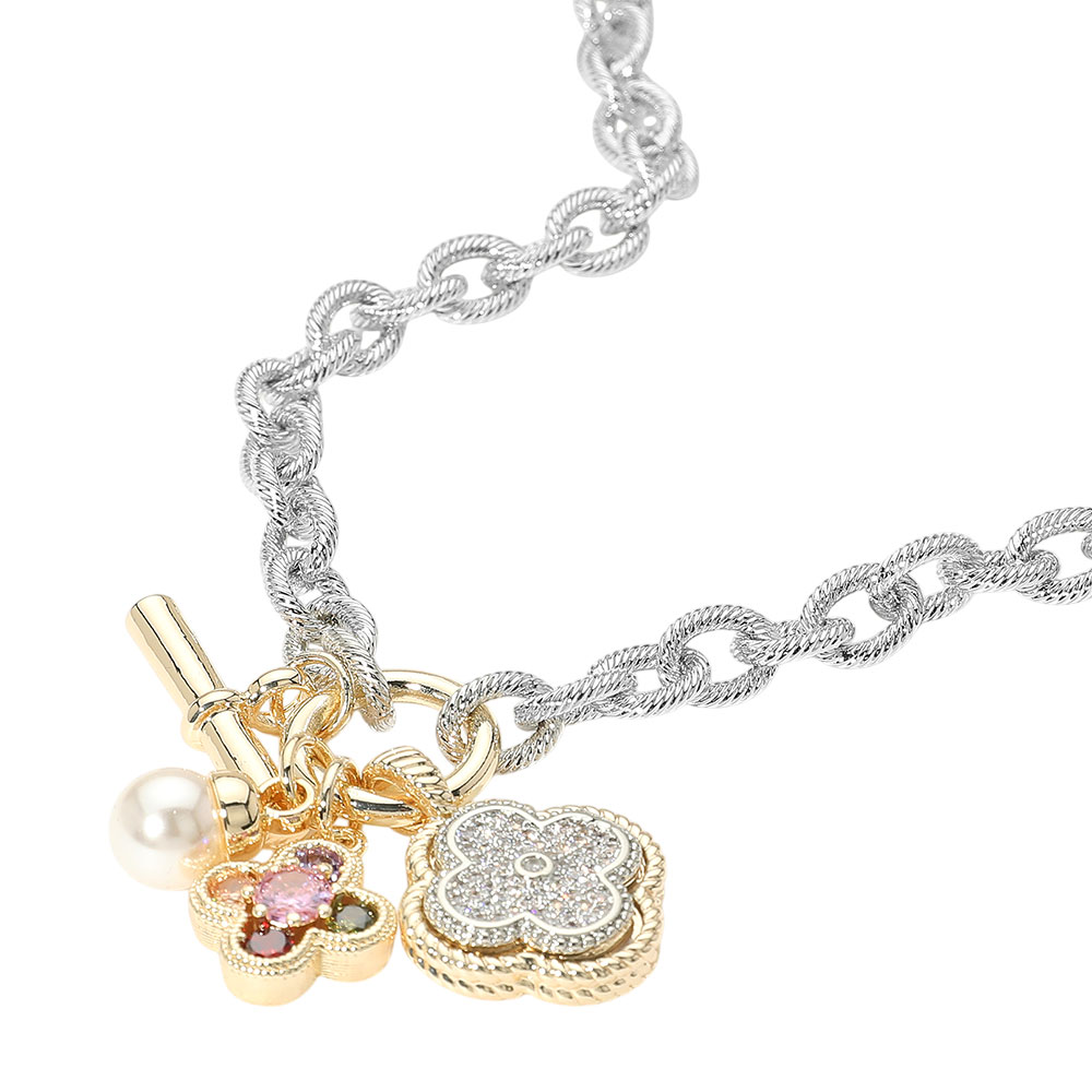 Details • Necklace Size : 17.5" + 2" L • Decor Size : 1.7" L • Elegant textured chain necklace featuring floral charms, crystal details, and a delicate pearl accent. A charming accessory to add a playful yet sophisticated touch to your look. • Gold Dipped