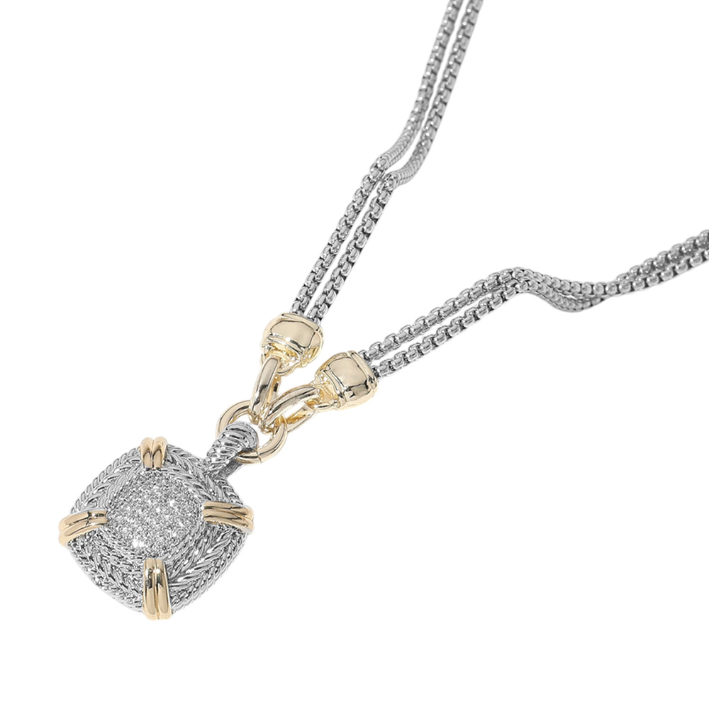 14K Gold Plated Two Tone CZ Stone Paved Square Pendant Double Chain Necklace