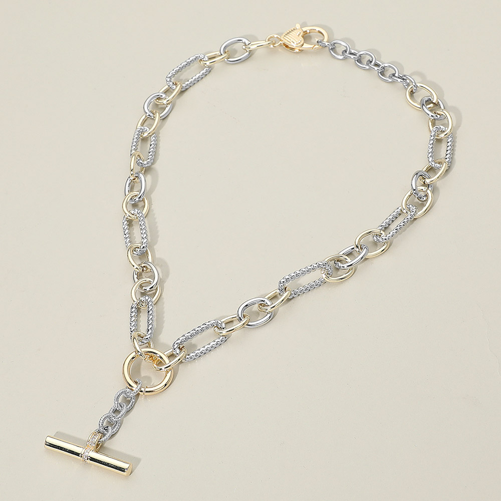 Details • Necklace Size : 16.5" + 2" L • Decor Size : 0.4" L • Pendant Size : 1" X 1.75" • Make a bold statement with this chain link necklace featuring mixed textures and a sparkling toggle clasp pendant. Its modern design pairs effortlessly with casual and dressy outfits, offering a chic layered look or standalone elegance. A versatile accessory to elevate your jewelry collection. • CZ Cubic Zirconia • Gold Dipped
