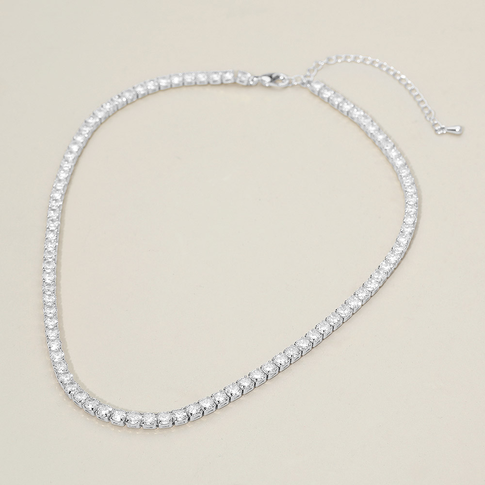 Details • Necklace Size : 16" + 3" L • Decor Size : 0.2" L • Classic tennis necklace featuring a sleek row of radiant round crystals that shimmer beautifully from every angle. Ideal for weddings, parties, or elegant daily wear. A refined jewelry piece that adds sophistication and luminous charm to any look or occasion. • Gold Dipped • Lead and Nickel Compliant