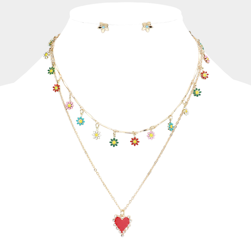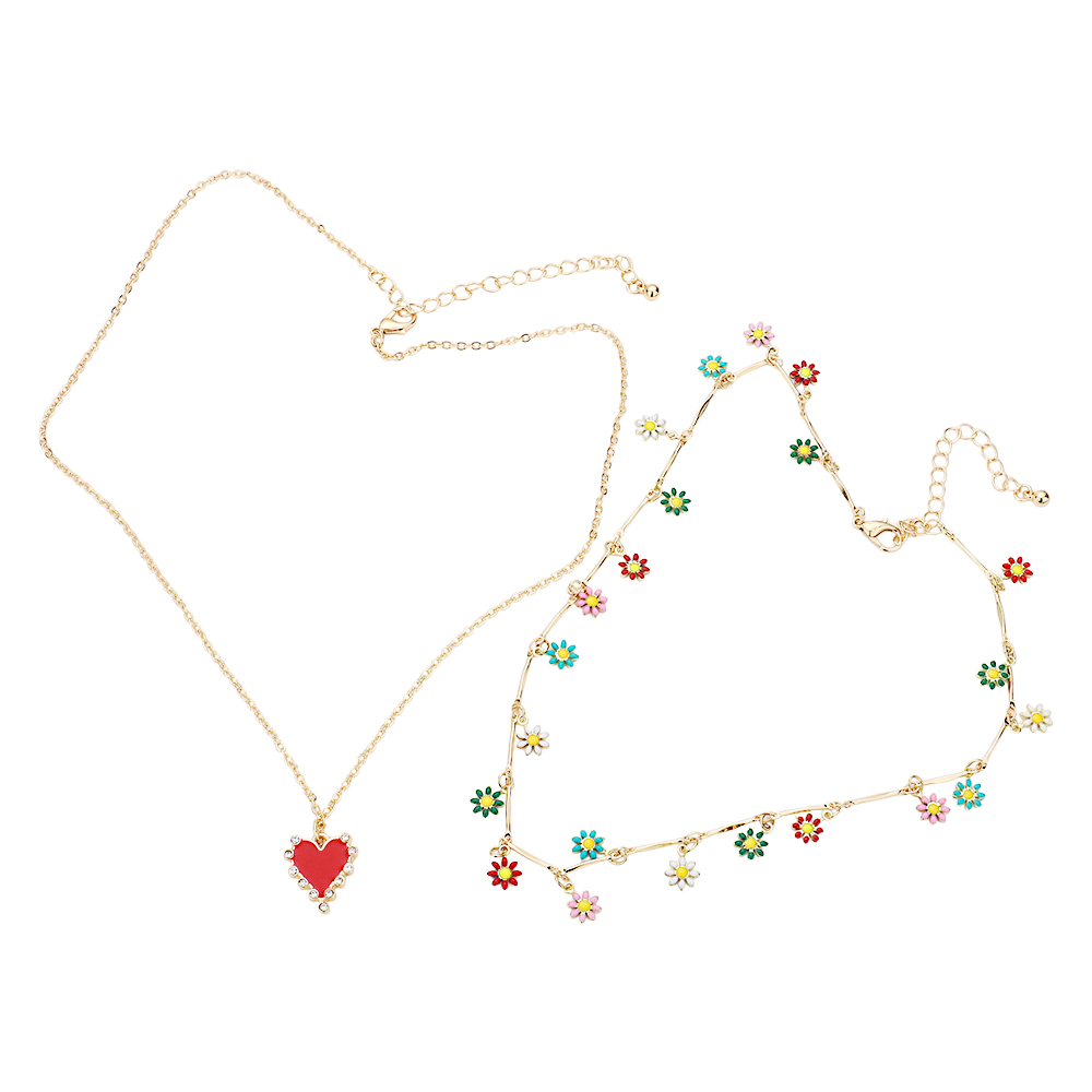 2PCS - Enamel Flower Station Rhinestone Trim Heart Pendant Necklaces