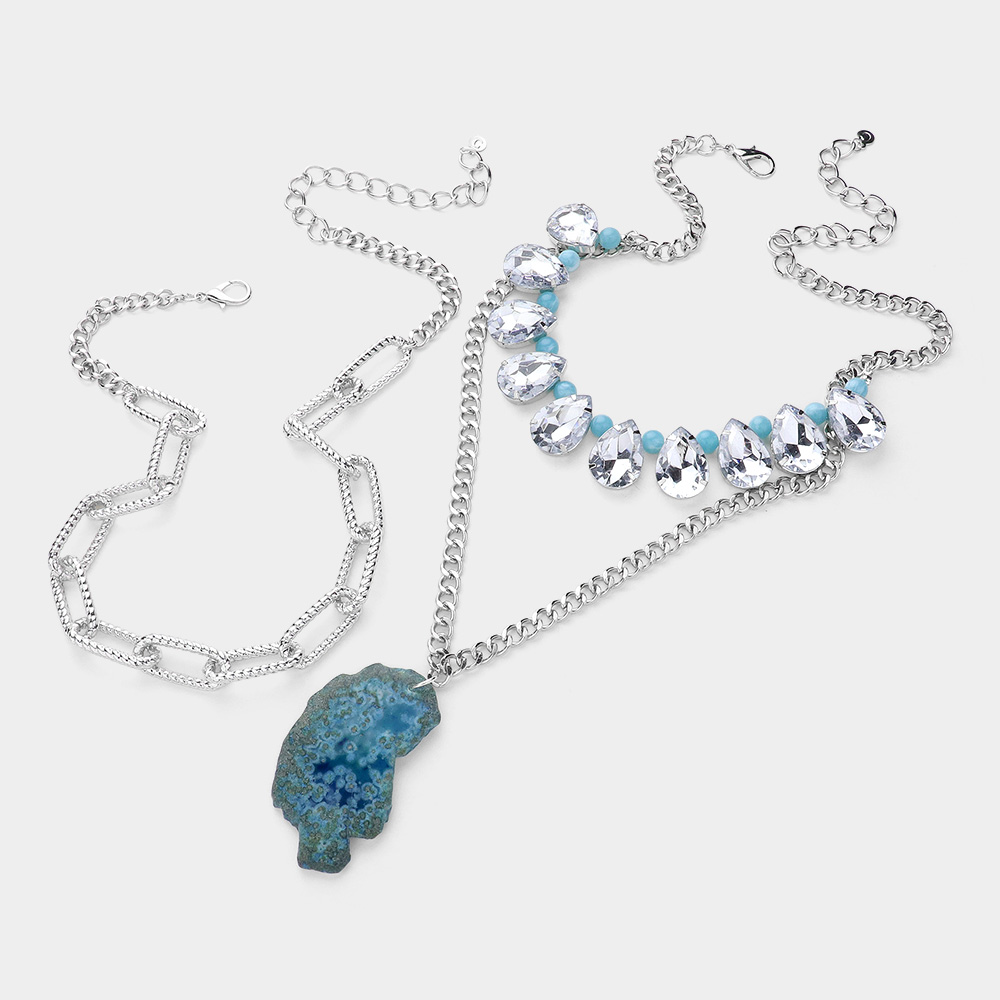 2PCS - Natural Stone Pendant Pointed Teardrop Stone Link Multi Chain Layered Statement Necklace