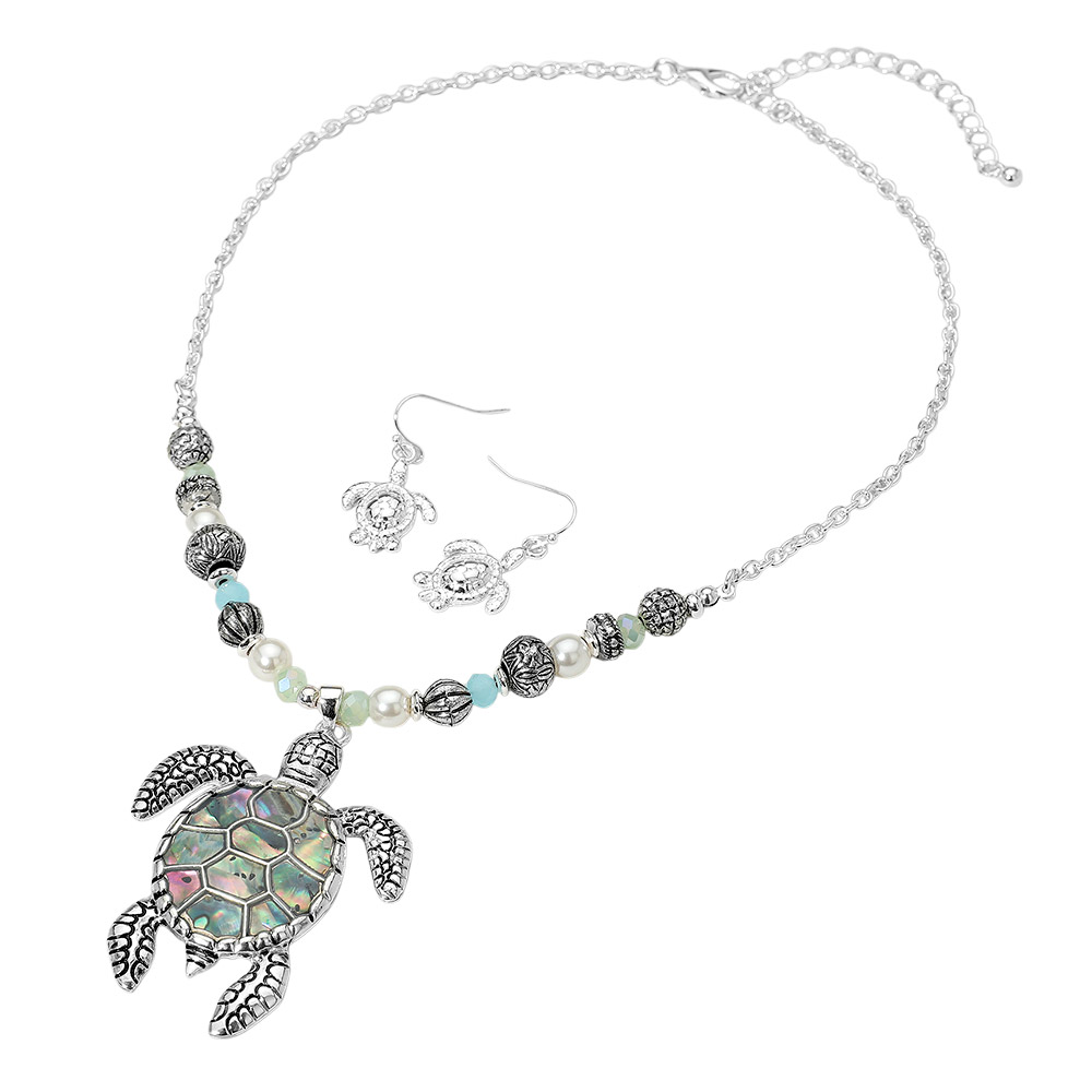 Details • Necklace Size : 17" + 3" L • Decor Size : 0.3" L • Pendant Size : 1.8" X 2.6" • Earrings Size : 1.25" L • Charming jewelry set featuring a turtle pendant necklace and matching earrings with decorative beads. A fun, beachy accessory ideal for casual wear or adding a playful touch to your everyday style. • Lead and Nickel Compliant