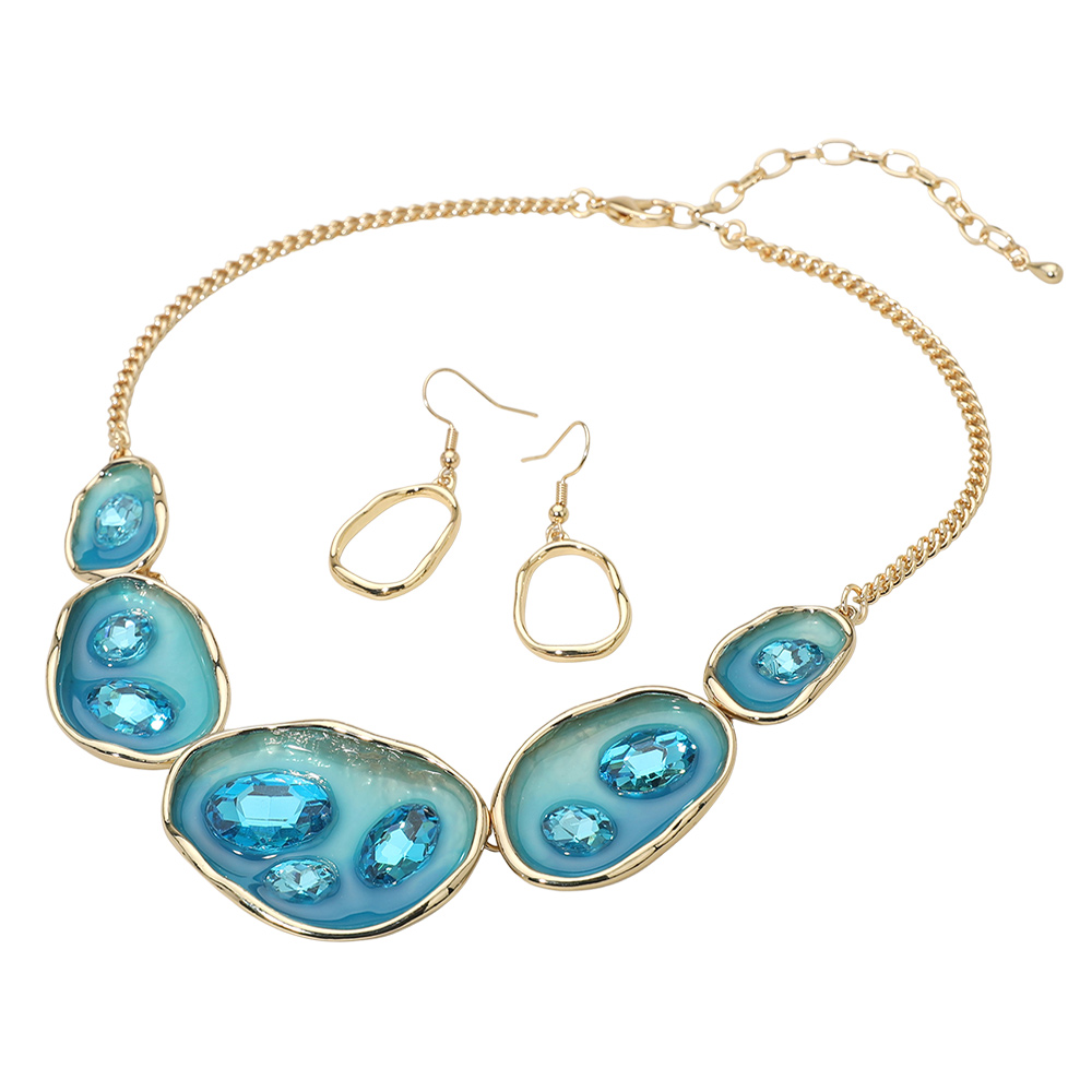 • Contemporary jewelry set featuring a bold necklace and matching earrings with artistic gem accents framed in fluid shapes. Perfect for parties, formal events, or chic everyday wear. A statement-making accessory that combines modern style with elegant sophistication.