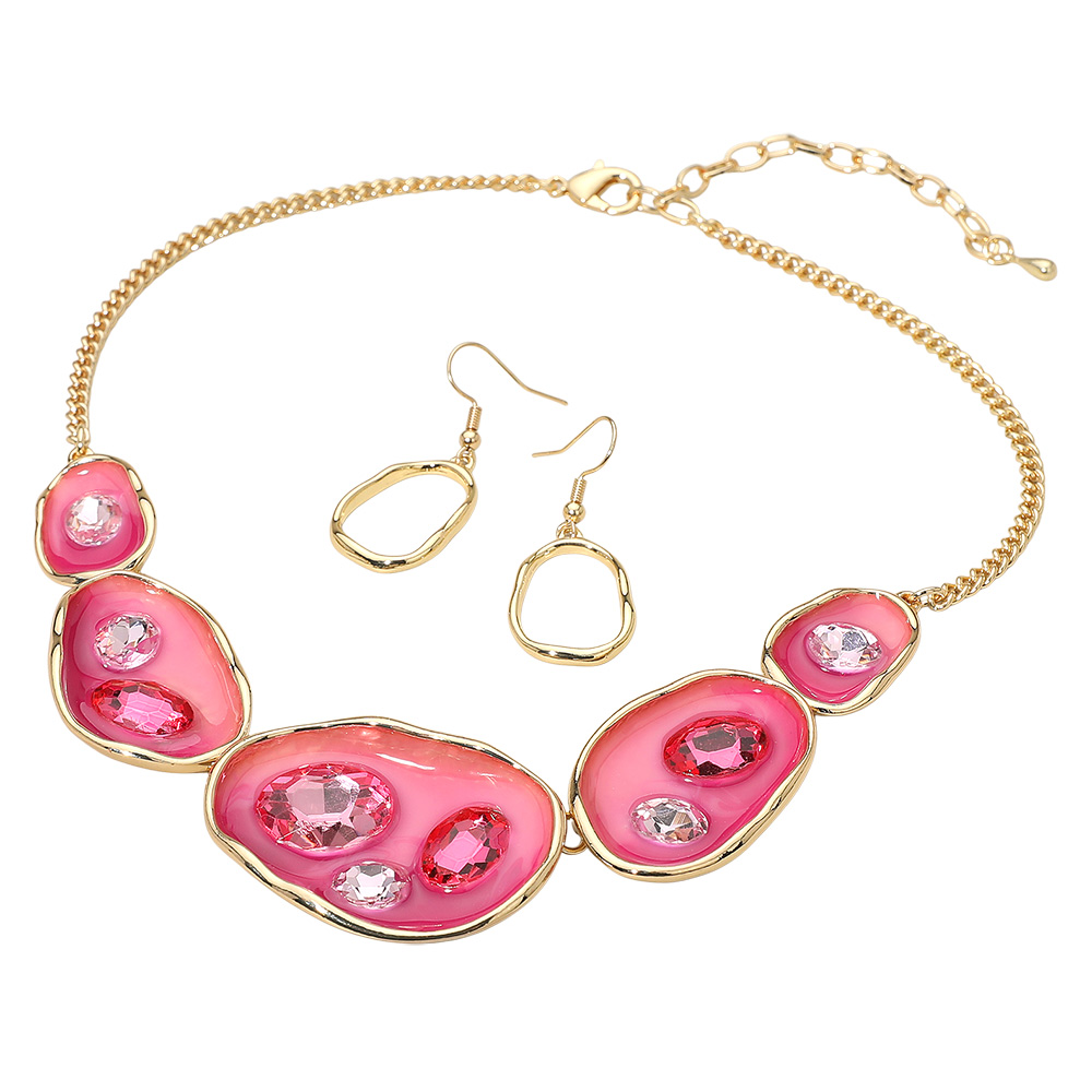 Details • Necklace Size : 16" + 3.25" L • Decor Size : 1.3" L • Earrings Size : 1.6" L • Contemporary jewelry set featuring a bold necklace and matching earrings with artistic gem accents framed in fluid shapes. Perfect for parties, formal events, or chic everyday wear. A statement-making accessory that combines modern style with elegant sophistication. • Lead and Nickel Compliant
