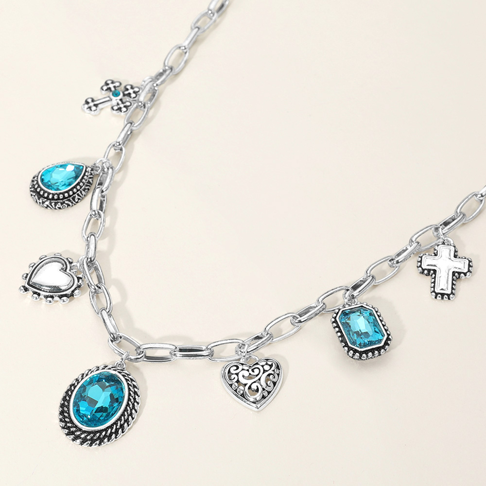 Details • Necklace Size : 16" + 3.25" L • Decor Size : 1.75" L • Elegant charm necklace featuring a mix of heart, cross, and gemstone-inspired pendants on a stylish chain. Perfect for layering or wearing solo, this versatile piece adds timeless character to casual and dressy outfits alike. • Lead and Nickel Compliant