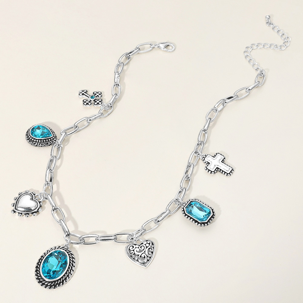 Antique Metal Oval Teardrop Rectangle Stone Cluster Metal Heart Cross Charm Station Necklace