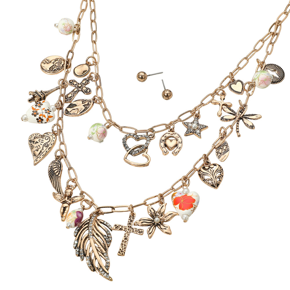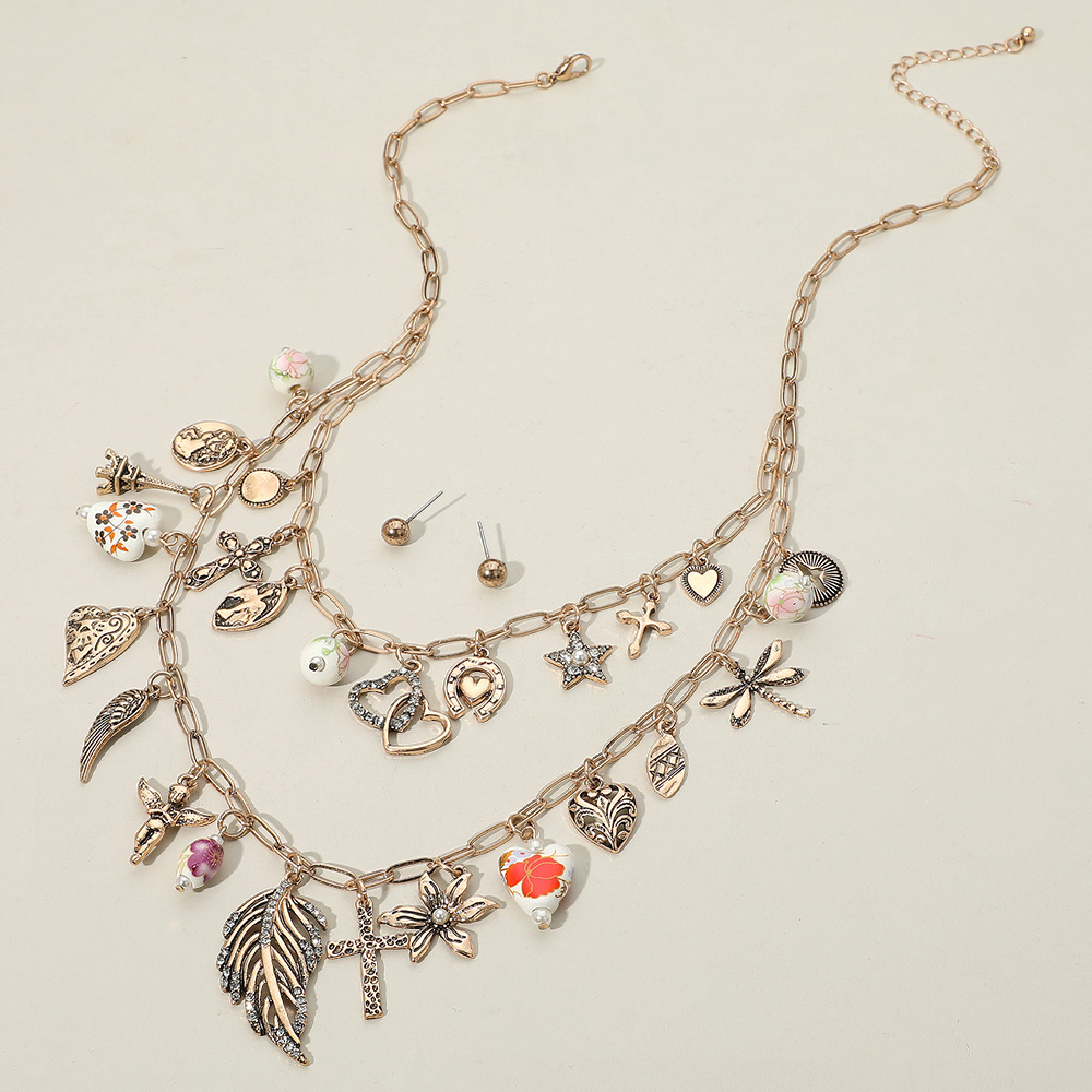 Details • Necklace Size : 18.5" + 3.25" L • Decor Size : 4.25" L • Earrings Size : 0.2" L • Complete your look with this layered charm necklace and matching earrings set featuring detailed pendants of hearts, leaves, stars, and florals. Designed with bold chain layers, this versatile jewelry set adds a touch of whimsy and elegance to both casual and dressy outfits. • Lead and Nickel Compliant