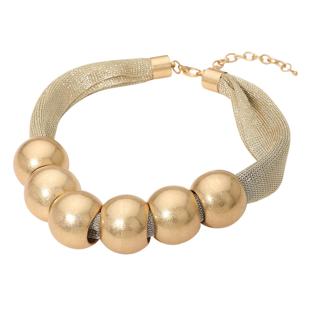 Details • Necklace Size : 18" + 3" L • Decor Size : 1.25" L • Make a striking statement with this bold mesh chain necklace featuring large rounded beads for a modern, sculptural look. Adjustable for a perfect fit, it adds instant impact to casual or dressy outfits. A standout accessory for gifting or elevating any jewelry collection with contemporary flair. • Lead and Nickel Compliant