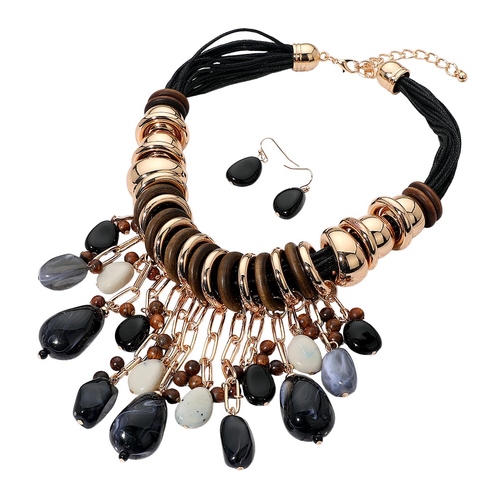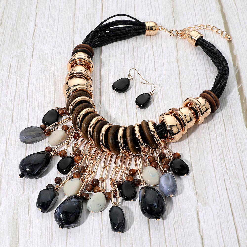 • Elevate your style with this layered bead necklace and earring set featuring sculpted rings, polished details, and cascading charms. Its dramatic mix of shapes and textures adds artistic depth and movement, creating a striking statement piece perfect for standout everyday looks or special occasions.
