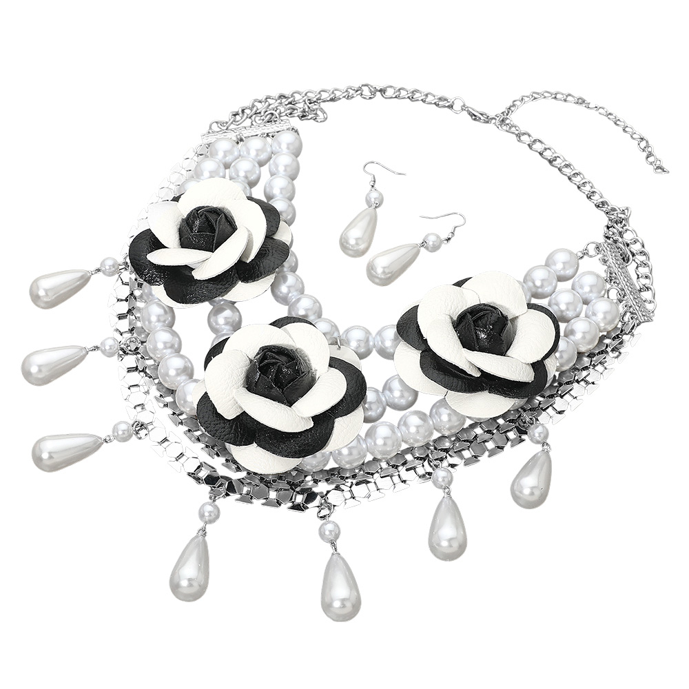 Bold Faux Leather Floral Embellished Pearl Strand Statement Necklace