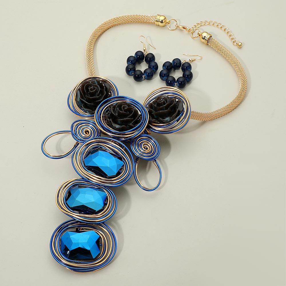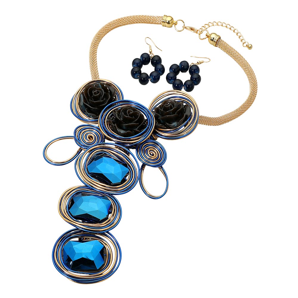 • This bold statement necklace and earring set showcases an artistic blend of floral motifs and faceted gem accents. Designed to stand out, it adds dramatic elegance and creative flair to any outfit, making it the perfect accessory for special events or evening glamour.
