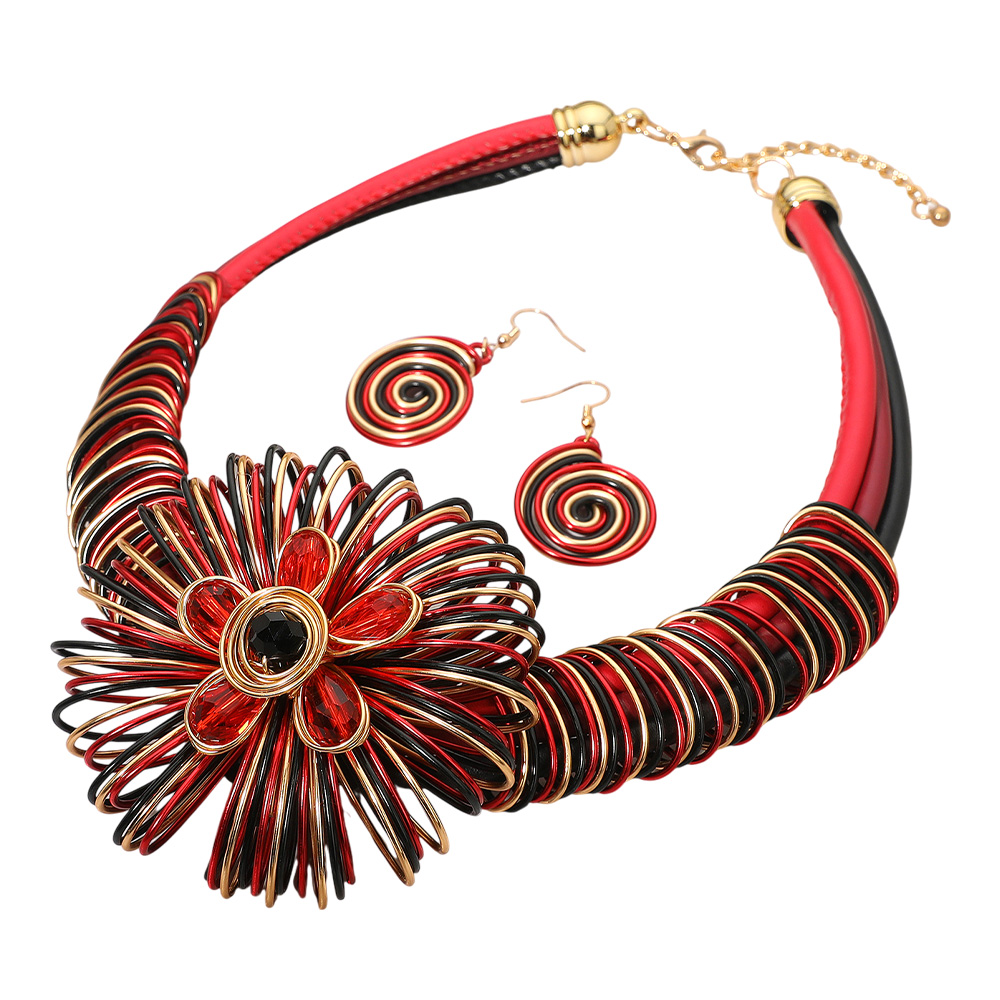 Details • Necklace Size : 20" + 3.5" L • Decor Size : 3.25" L • Earrings Size : 2.25" L • Make a bold fashion statement with this exquisite necklace and earring set, featuring a large flower centerpiece with layered loops and crystal accents. Paired with spiral drop earrings, this set adds artistic flair and contemporary charm to any elegant or casual outfit. • Lead and Nickel Compliant