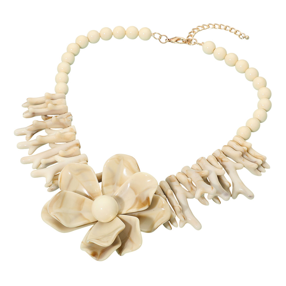 • Bold statement necklace showcasing a large sculpted flower centerpiece framed by coral-style accents and smooth round beads. Designed with an adjustable chain for a customizable fit, perfect for adding an artistic touch to any outfit.