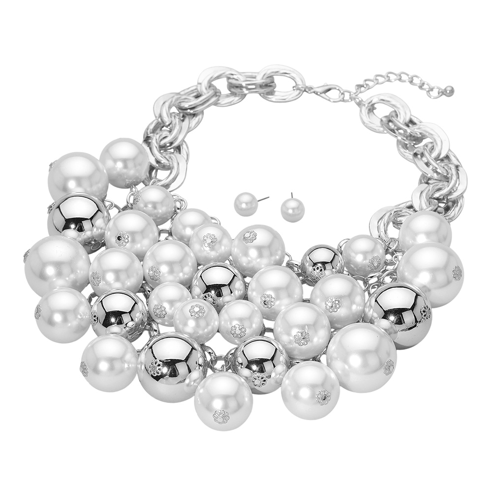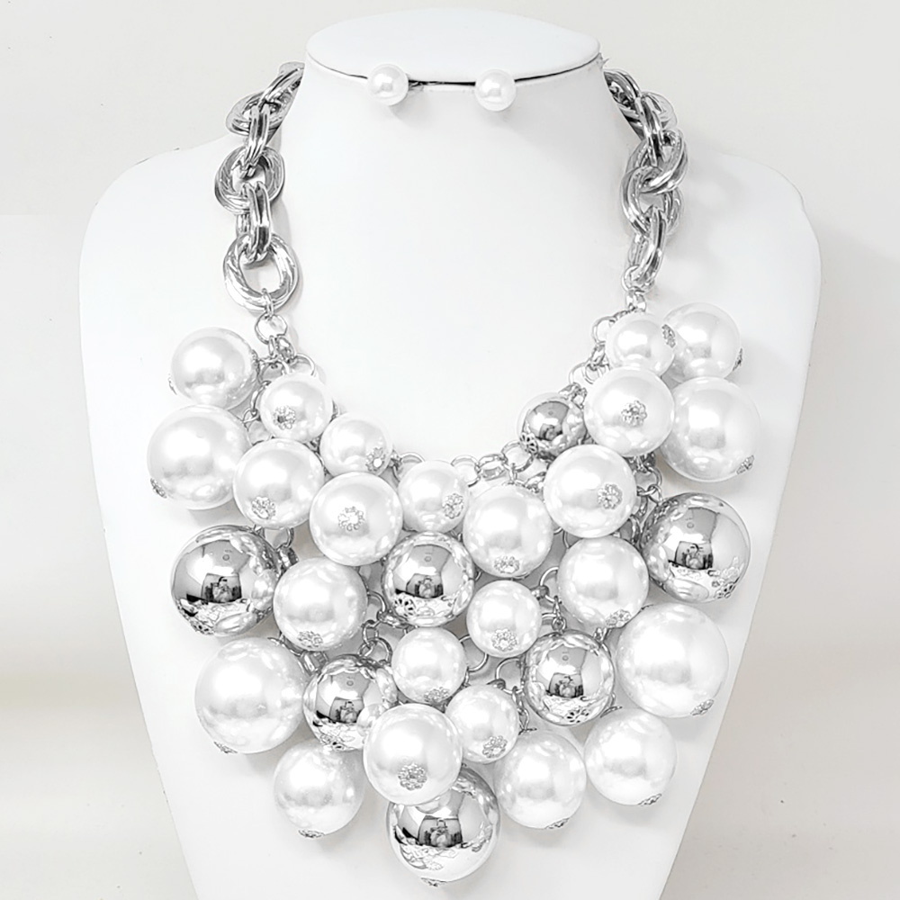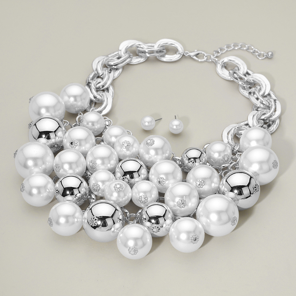 Details • Necklace Size : 18.5" + 3.25" L • Decor Size : 4" L • Earrings Size : 0.4" L • Make a striking impression with this bold statement necklace designed with oversized reflective beads and chunky chain links. Perfect for glamorous evenings or standout fashion looks, this dramatic piece brings shine, sophistication, and modern edge to any outfit. • Lead and Nickel Compliant