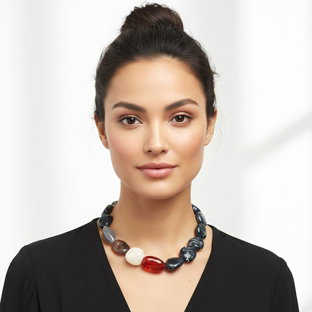 • Bold nugget bead statement necklace featuring large irregular-shaped beads with a smooth polished finish. Designed with an adjustable extender for a comfortable fit, this eye-catching accessory adds natural elegance and texture to everyday looks or elevated outfits. Perfect for gifting or styling.