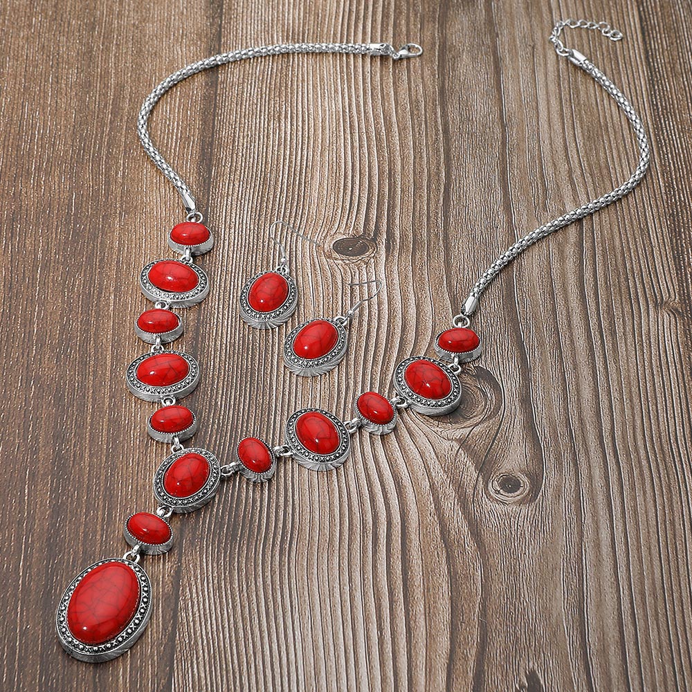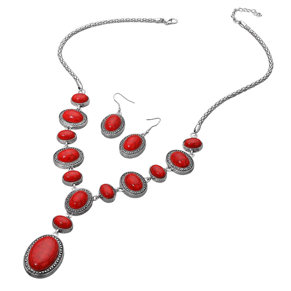 Details • Necklace Size : 24" + 2" L • Decor Size : 2.3" L • Earrings Size : 1.75" L • Make a striking impression with this elegant jewelry set featuring an array of oval accents arranged in a cascading silhouette. Paired with matching drop earrings, this standout design brings a refined, vintage-inspired touch that instantly elevates evening outfits and special occasion style. • Lead and Nickel Compliant