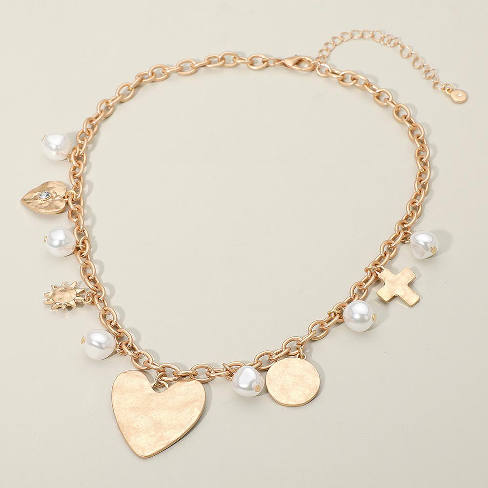 Brushed Metal Heart Cross Pearl Charm Station Chunky Necklace