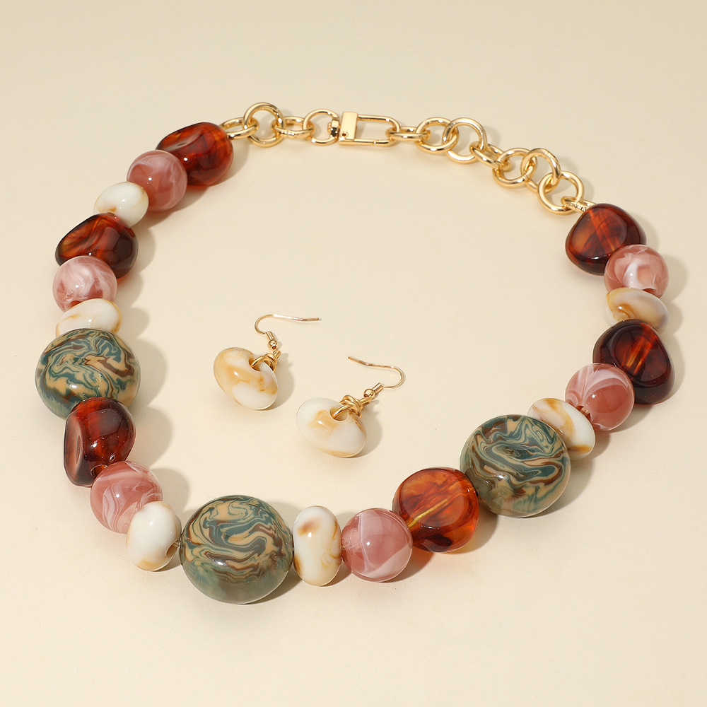 Details • Necklace Size : 19" + 3.5" L • Decor Size : 1.25" L • Earrings Size : 1.75" L • Chunky beaded necklace and matching earring set designed to add bold style and vibrant charm. Featuring multicolored beads in unique patterns, this fashion jewelry set is perfect for parties, casual outings, or statement looks, offering a chic and artistic touch to elevate any outfit. • Lead and Nickel Compliant